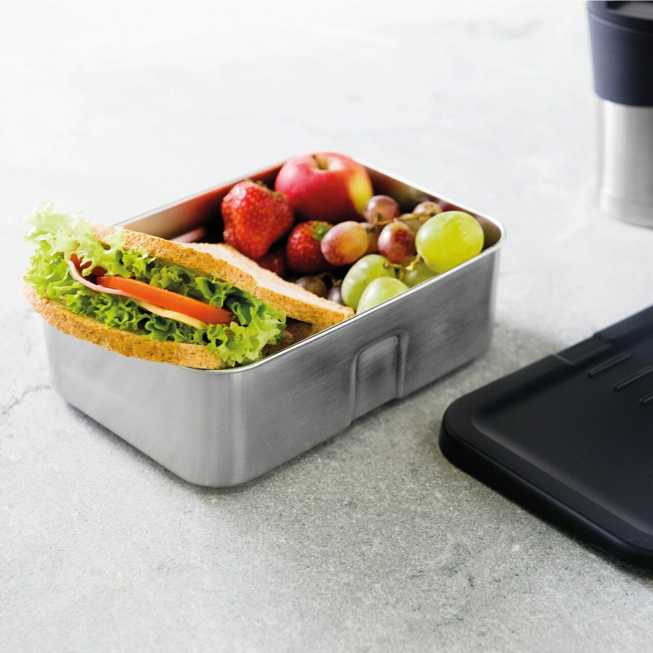La birou, la scoala sau in deplasare, va puteti bucura cu usurinta de un pranz echilibrat oriunde va aflati cu aceasta cutie pentru pranz, realizata din otel inoxidabil. Pur si simplu impachetati fructele si legumele preferate sau un sandvis gustos in recipientul de dimensiuni generoase si infasurati banda elastica din silicon in jurul cutiei pentru a mentine capacul strans. Datorita otelului inoxidabil de inalta calitate, aveti la dispozitie o cutie de pranz durabila, care nu numai ca este usor de curatat, dar va rezista si testului timpului. Dimensiuni interioare 20 x 14 x 6.5 cm. Dimensiuni exterioare 21 x 14.5 x 7 cm. Compozitie material: inox 18/10, polipropilena, finisaj satinat.