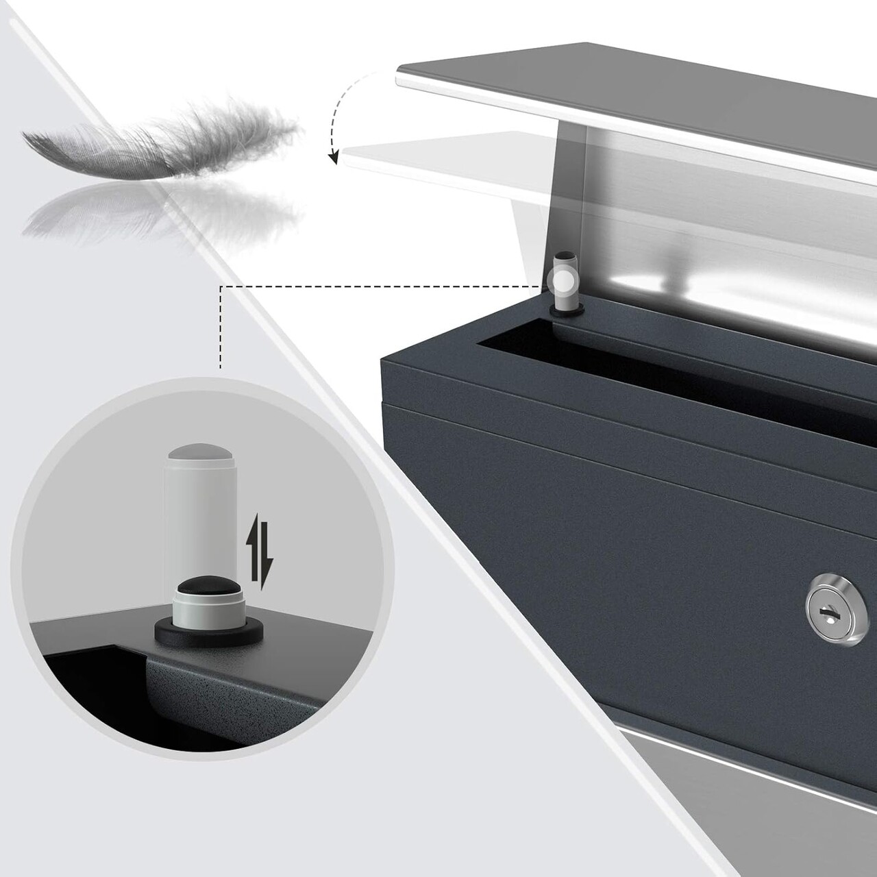 Desi exteriorul sau este rigid, aceasta cutie postala ramane foarte fina: un mecanism special se asigura ca capacul se inchide usor, incet si silentios.