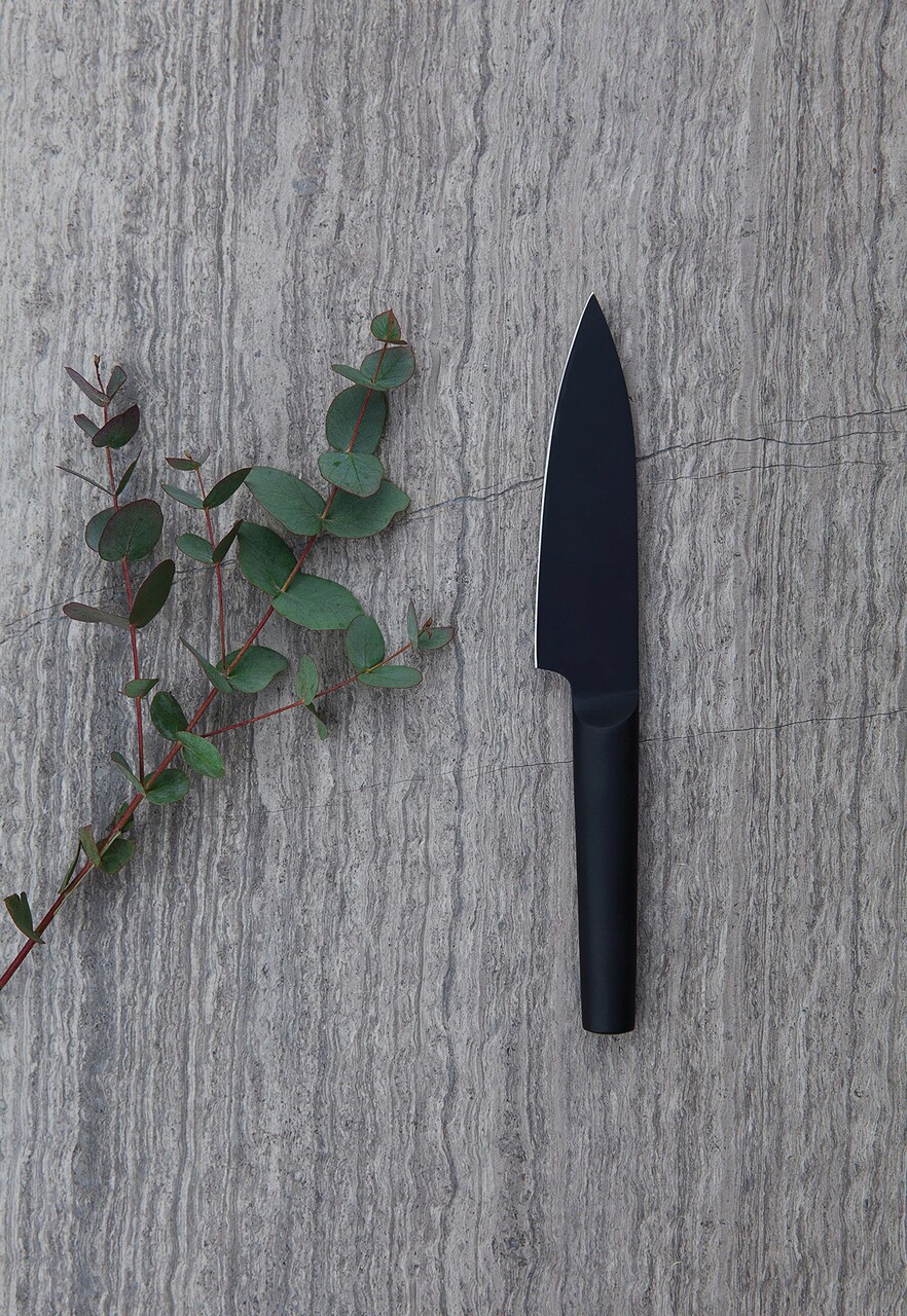 Acest cutit de bucatar de 13 cm este un cutit multifunctional grozav pentru a taia, felia, marunti sau toca cu precizie ingredientele preferate. Fie ca doriti sa taiati in cubulete branza, sa tocati salata sau sa taiati un piept de pui, acest cutit complet negru din otel inoxidabil cu invelis antiaderent este ajutorul dvs. de bază din bucatarie. Deoarece este mai mic decat un cutit de bucatar standard, cantareste putin si este usor de manevrat. A se spala manual. Lungime lama: 13 cm.