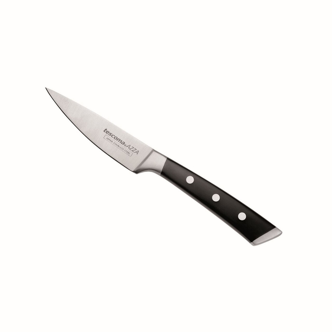 Gama Azza de la Tescoma este linia de top a cunoscutului brand, oferind cutite semi-profesioniste. Cutitele au lama turnata dintr-o singura bucata, din otel inoxidabil japonez de calitate superioara, cu duritate de 55-57 HRC, cu o durata mare de viata si rezistenta ridicata la ruginire. Produsele au o calitate superioara, sunt foarte practice si ergonomice, avand un design functional si placut. Cutitul cu lama turnata dintr-o singura bucata, din otel inoxidabil japonez si maner ergonomic din plastic rezistent, fixat cu trei nituri solide din otel pentru o stabilitate mai buna, perfect pentru uz profesional si domestic deopotriva. Acesta este un cutit multifunctional, ideal pentru taierea si tocarea legumelor, cat si pentru taierea, decuparea, felierea oricarui tip de carne. Poate fi spalat, in conditii de siguranta, in masina de spalat vase.