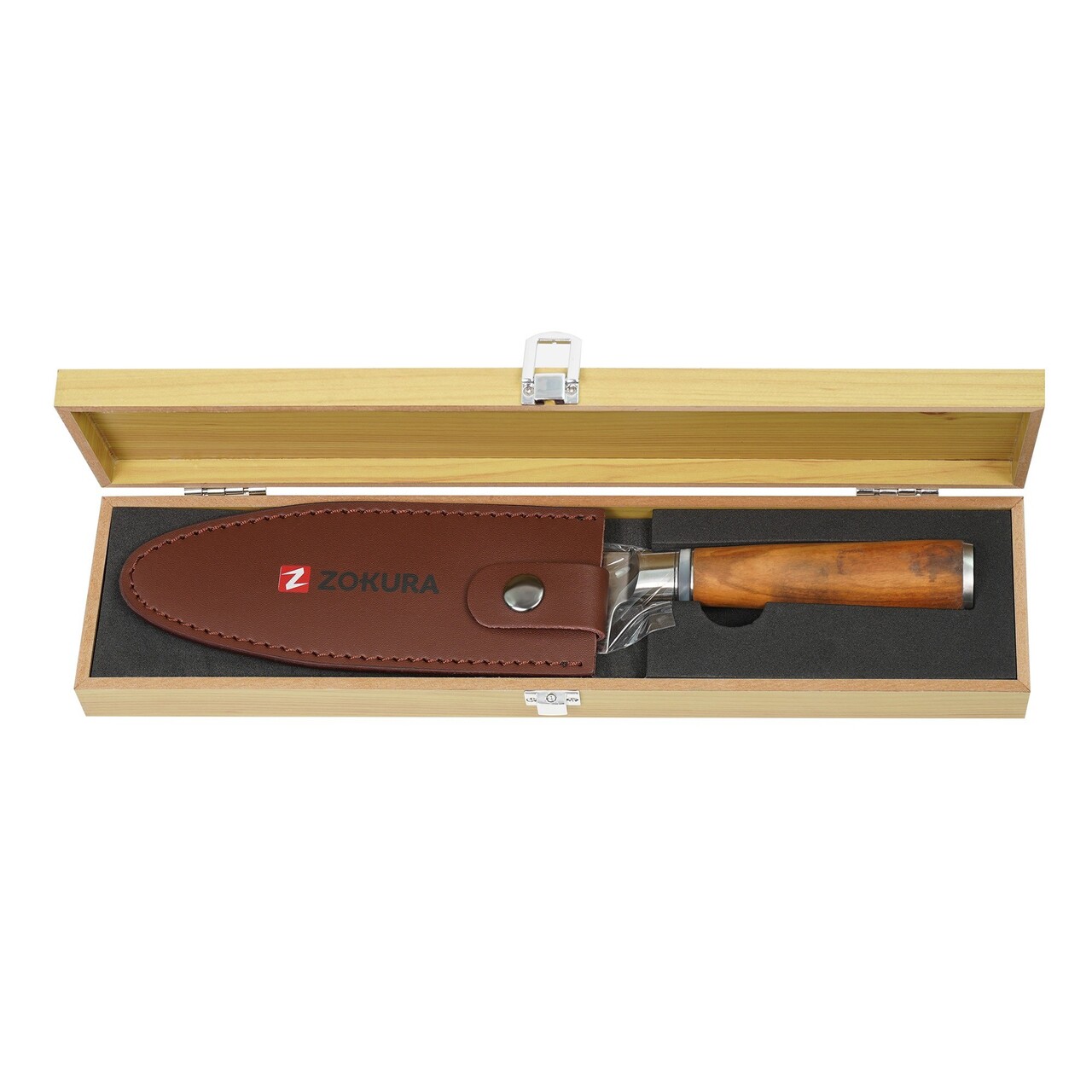 Cutitul are un maner fabricat din lemn de maslin si se livreaza impreuna cu o teaca de protectie maro, Din piele, Alaturi de o cutie cadou din lemn.