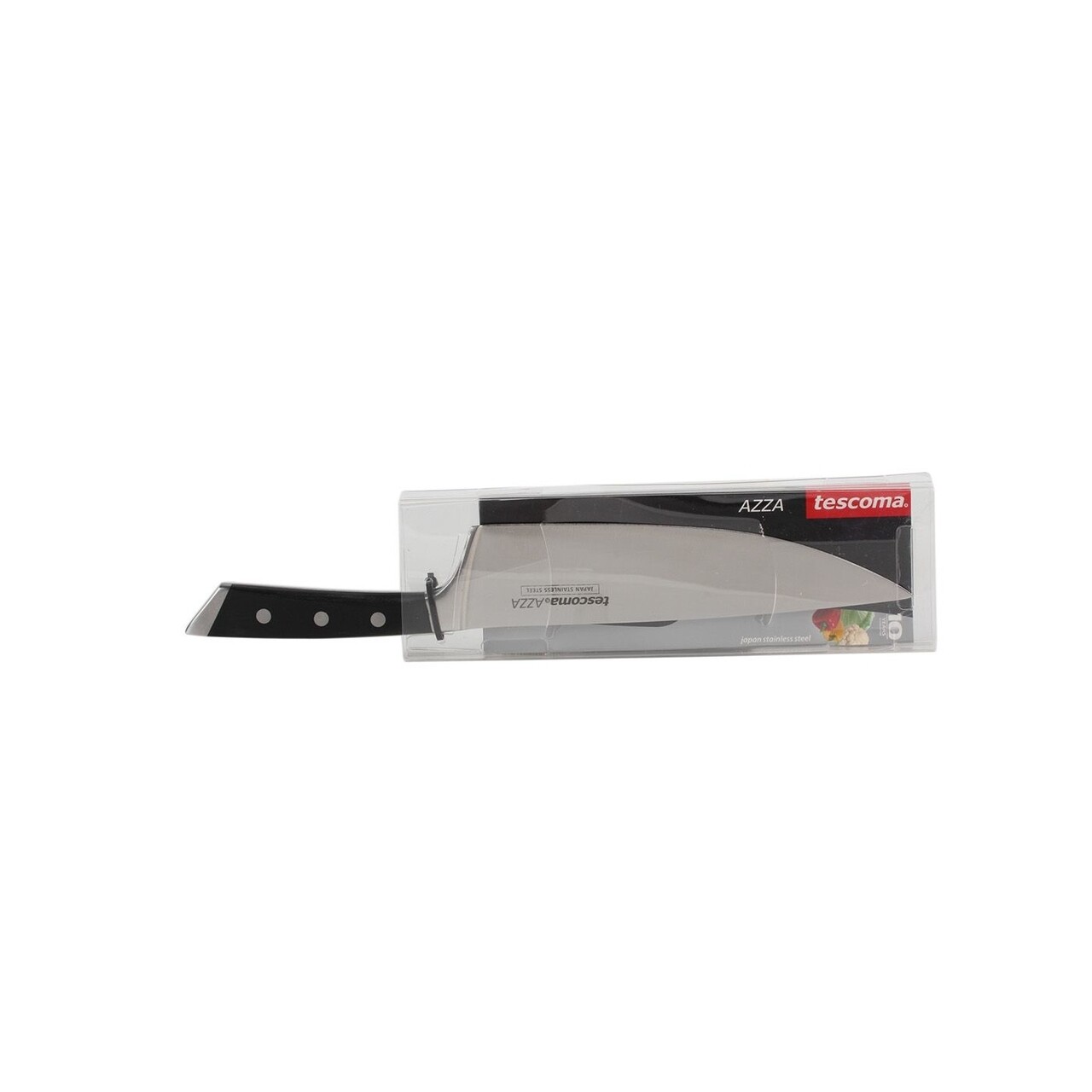 Gama Azza de la Tescoma este linia de top a cunoscutului brand, oferind cutite semi-profesioniste. Cutitele au lama turnata dintr-o singura bucata, din otel inoxidabil japonez de calitate superioara, cu duritate de 55-57 HRC, cu o durata mare de viata si rezistenta ridicata la ruginire. Produsele au o calitate superioara, sunt foarte practice si ergonomice, avand un design functional si placut. Cutitul cu lama turnata dintr-o singura bucata, din otel inoxidabil japonez si maner ergonomic din plastic rezistent, fixat cu trei nituri solide din otel pentru o stabilitate mai buna, perfect pentru uz profesional si domestic deopotriva. Cutitul bucatarului este cel mai utilizat cutit si te va ajuta indiferent de ingredientele cu care vei lucra. Poti sa tai, sa toci sau sa feliezi cu el legume, fructe si carnuri, fiind un cutit indispensabil oricarui bucatar, amator sau profesionist. Poate fi spalat, in conditii de siguranta, in masina de spalat vase.