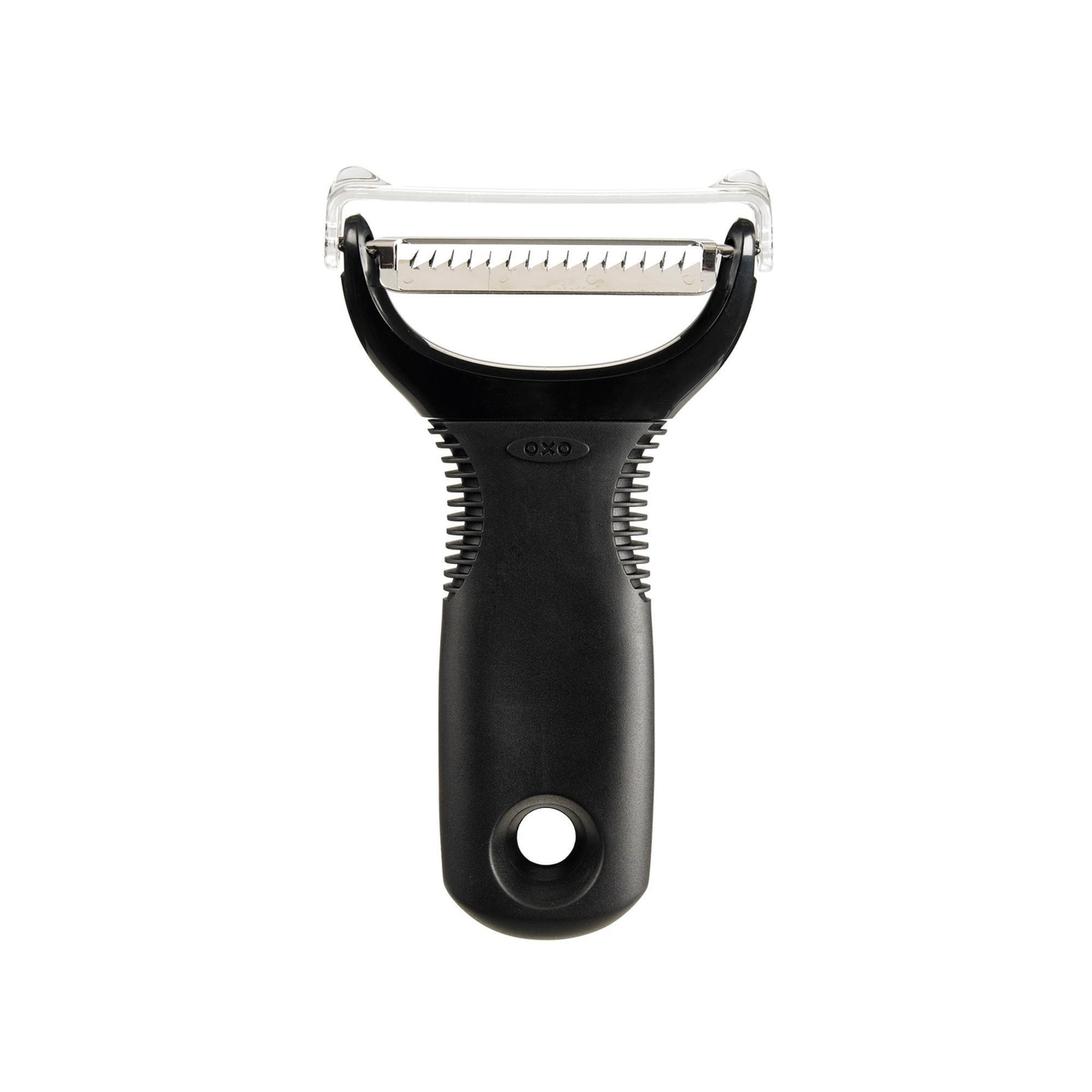 Decojitor, MarcaOXO, Cu 2 lame din Inox si maner dinPlastic.Ideal pentru taierea julienne a legumelor si fructelor precum:Dovlecei, Cartofi, Morcovi, Mere sau citrice sau pentru simpla curatare a acestora.