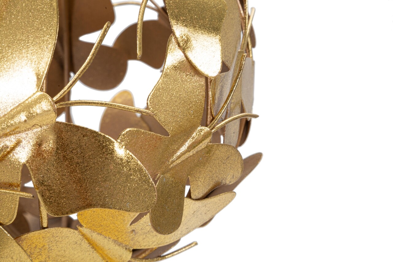 Sculptura eleganta din metal auriu in forma de sfera compusa din fluturi zburatori.