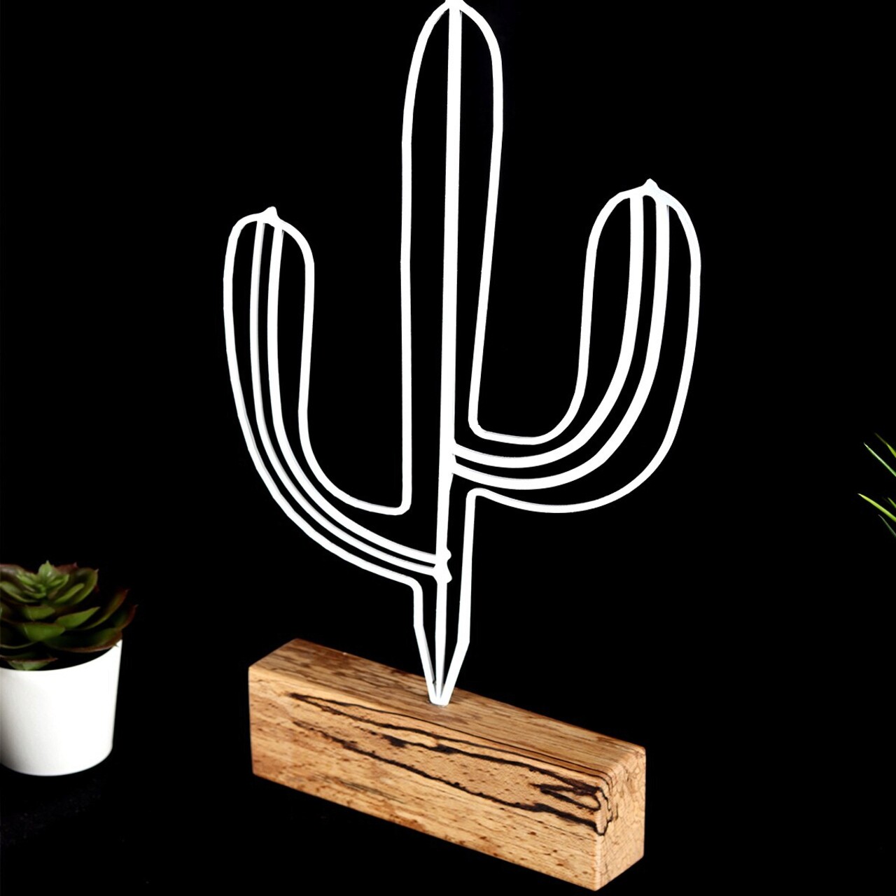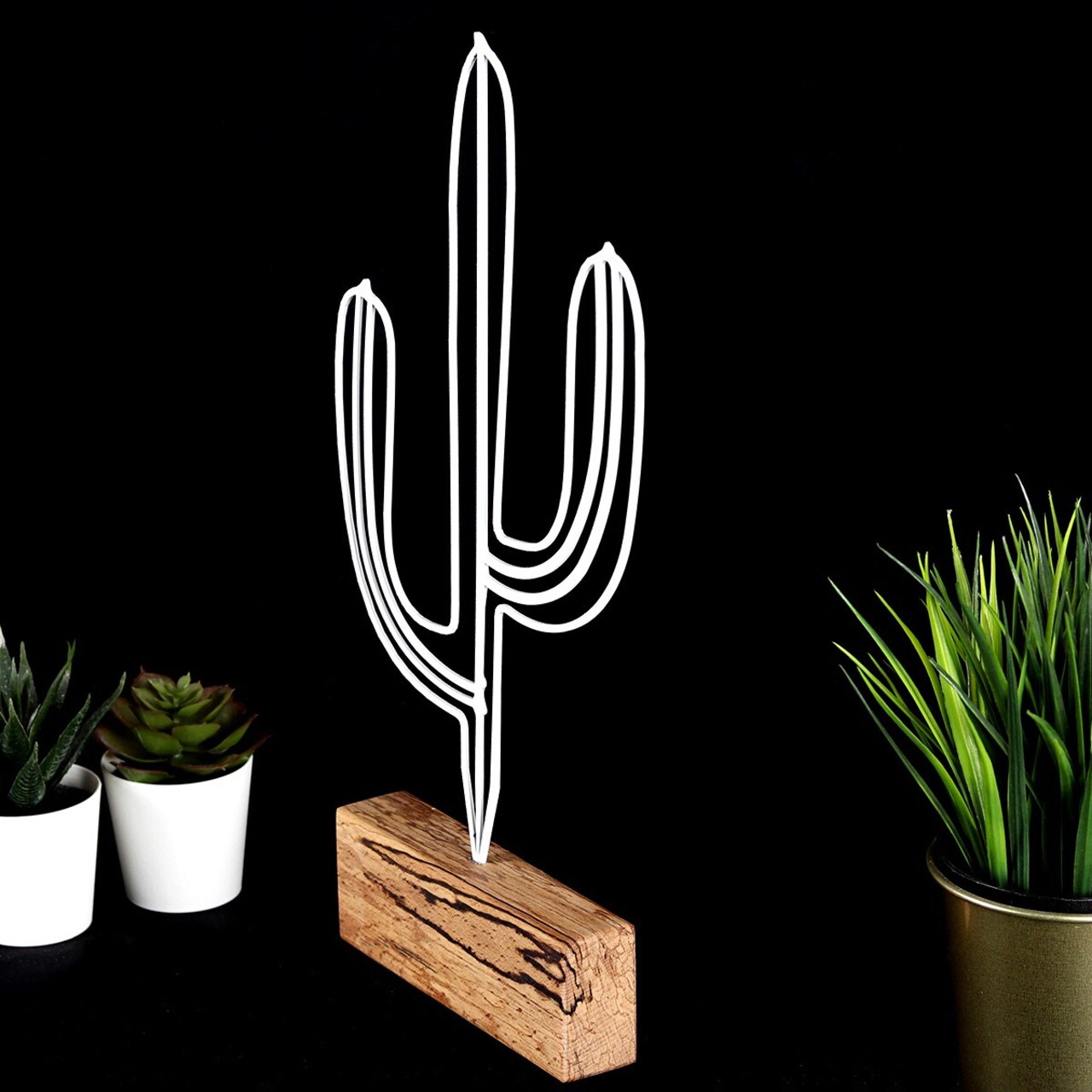 Decoratiune, Cactus, 17x37x3.5 cm, Metal, Alb