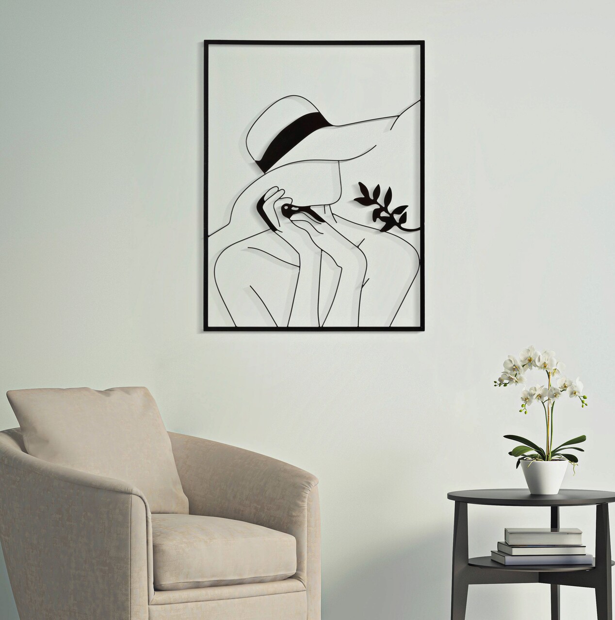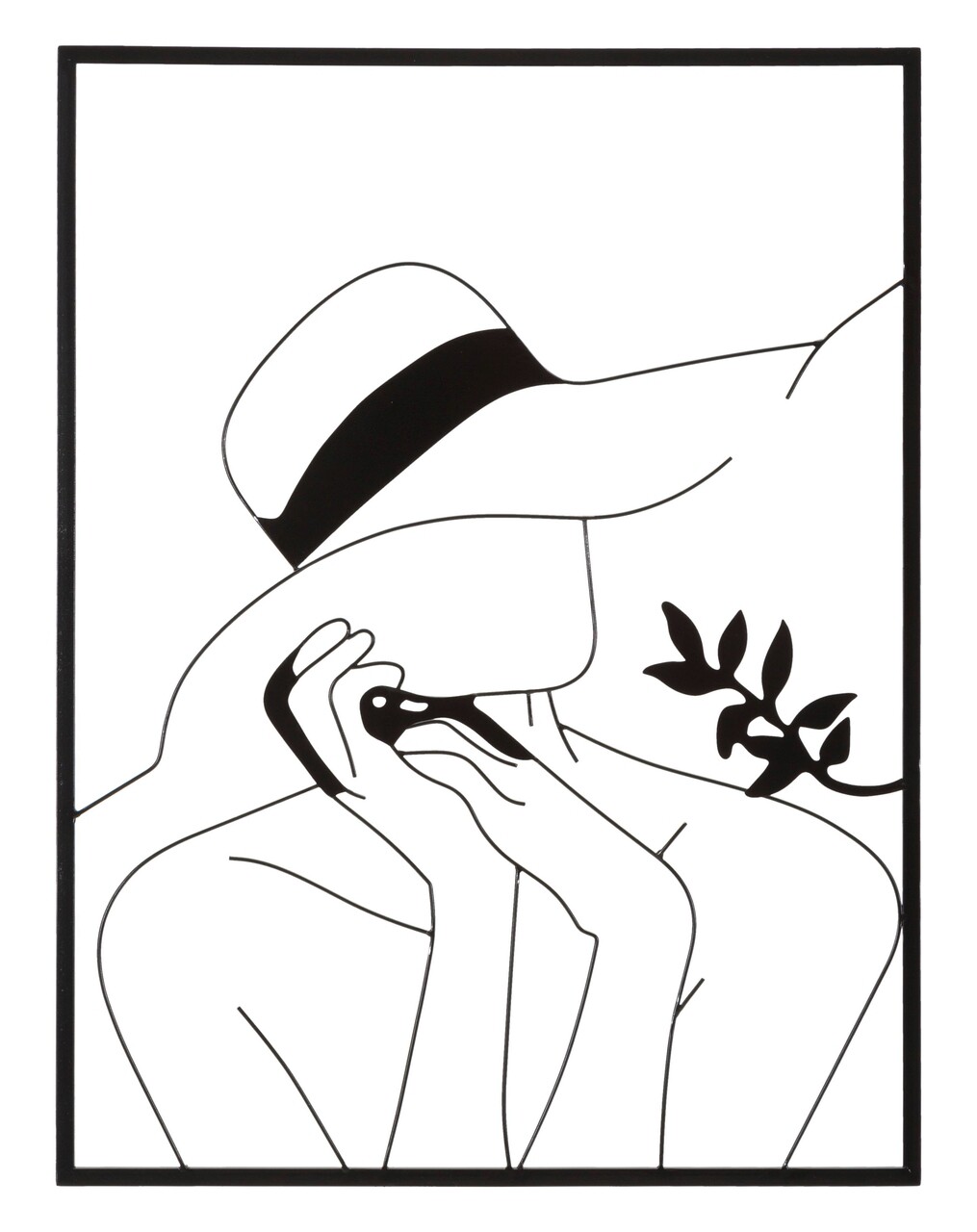 Panou decorativ de perete 3D cu linii simple, care compun o figura feminina cu o palarie eleganta, toate incadrate intr-un cadru dreptunghiular.