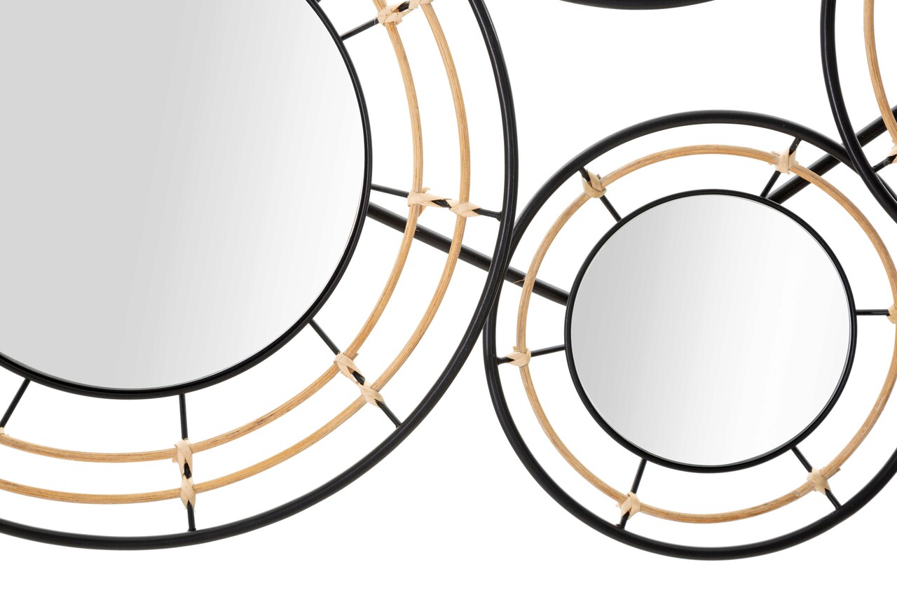 Panou decorativ de perete 3D compus dintr-un set de cercuri de diferite dimensiuni cu oglinzi si finisaje din ratan. Compozitia in ansamblul ei da o nota etnica oricarui ambient.