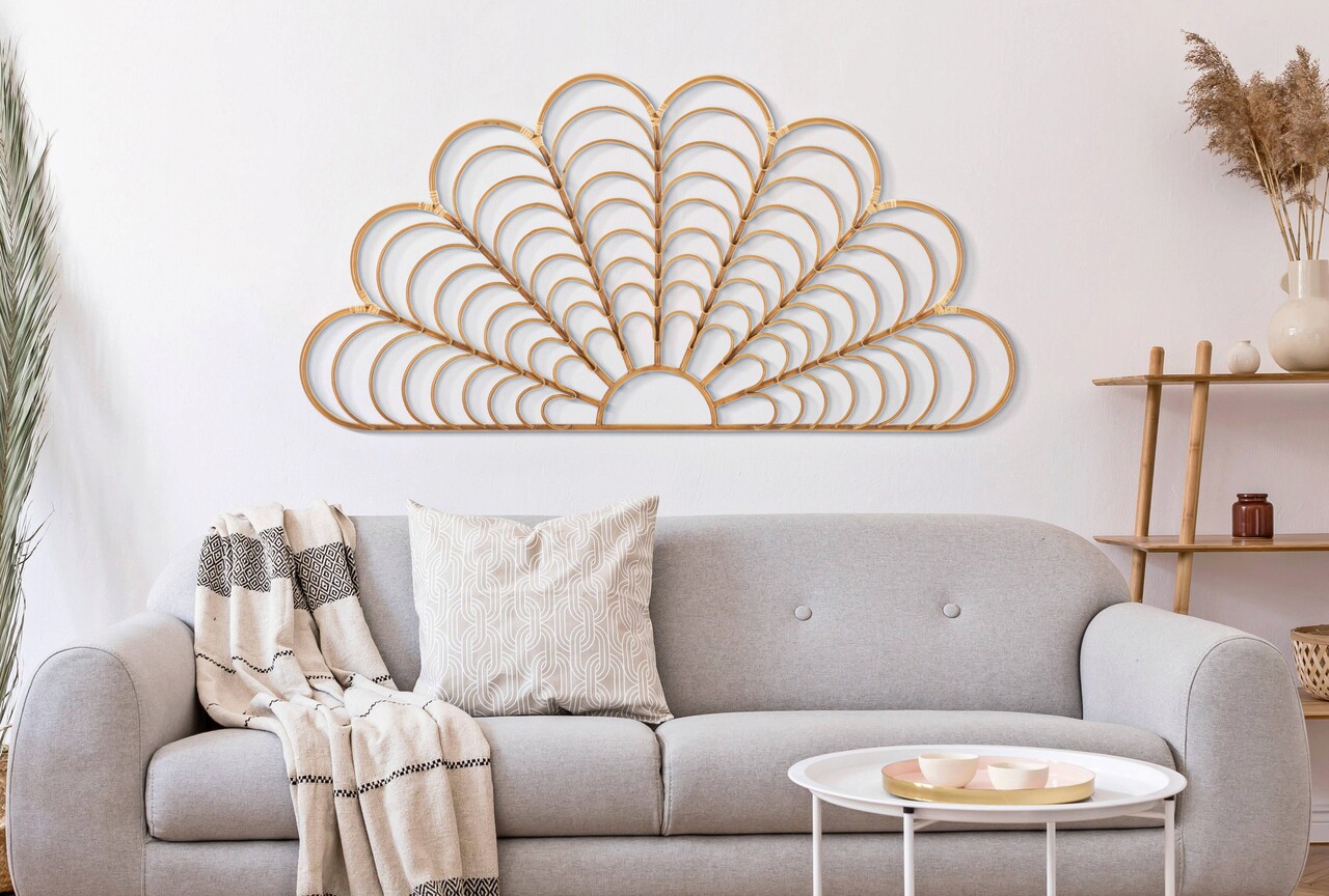 Panou decorativ de perete 3D cu o finisare care aminteste de bambus. Forma eleganta aminteste de un evantai.