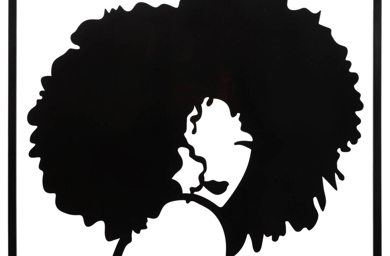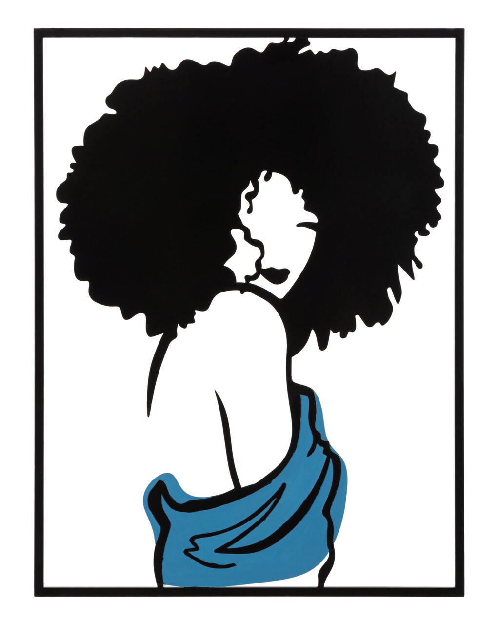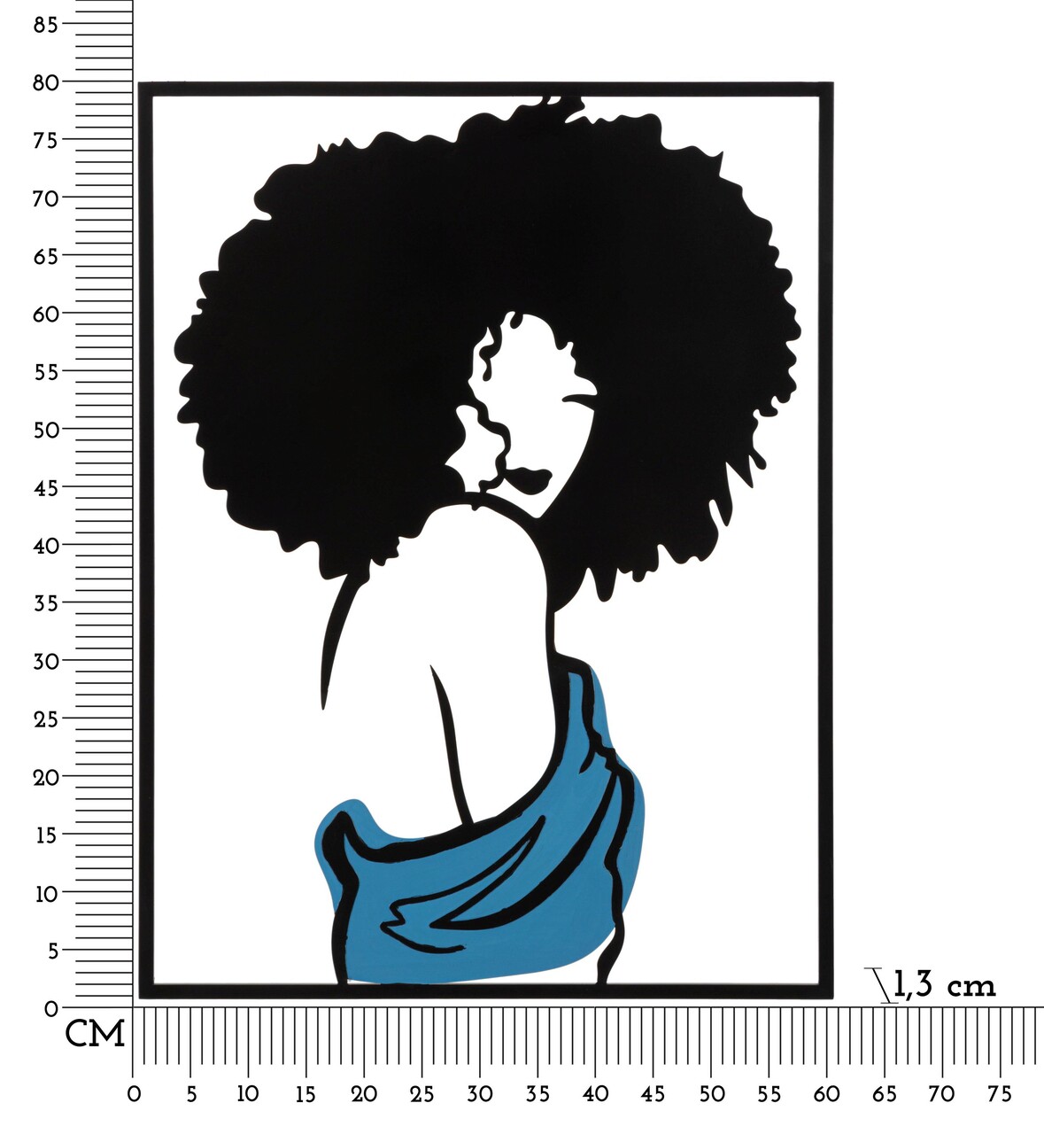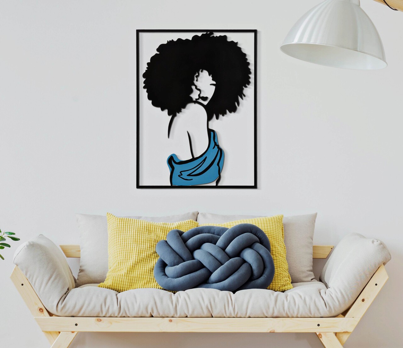 Panoul decorativ de perete din metal 3D care infatiseaza o femeie cu o rochie eleganta in culori stralucitoare.
