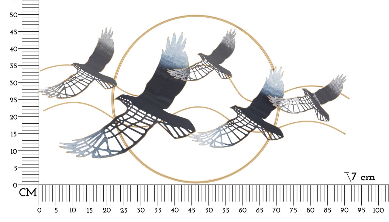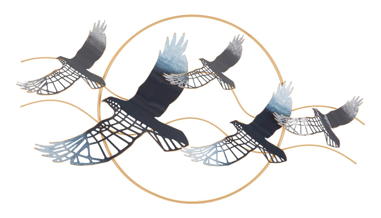 Panou decorativ de perete 3D reprezentand pasari zburatoare de diferite culori cu rama din fier aurie rotunda si eleganta.