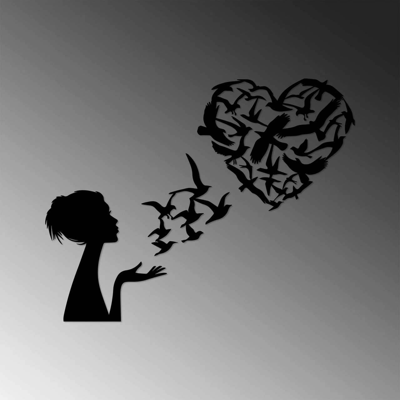 Decoratiune de perete, Birds Woman Heart, Metal, Dimensiune: 63 x 50 cm, Negru