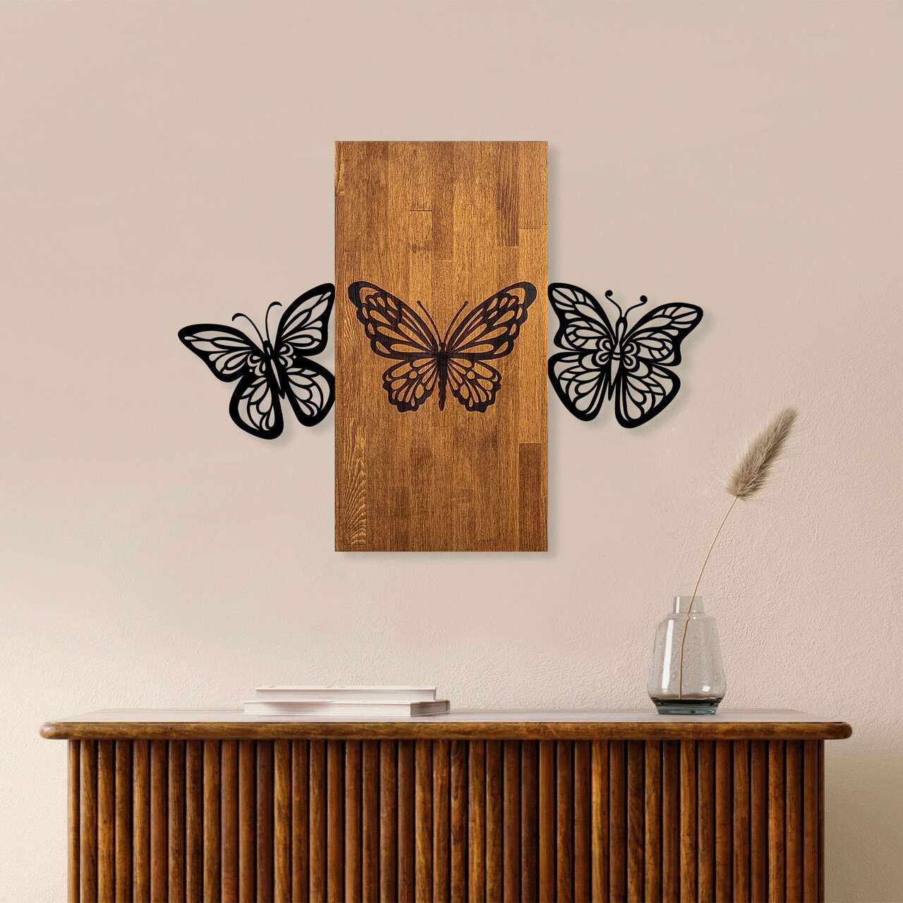 Decoratiune de perete, Butterflies 2, Lemn/metal, Dimensiune: 74 x 58 cm, Nuc / Negru
