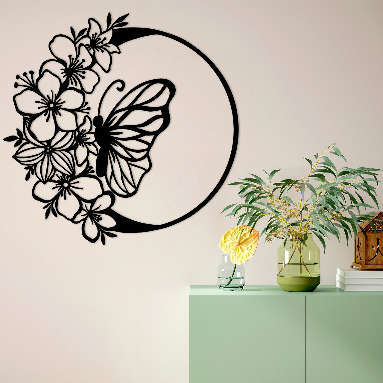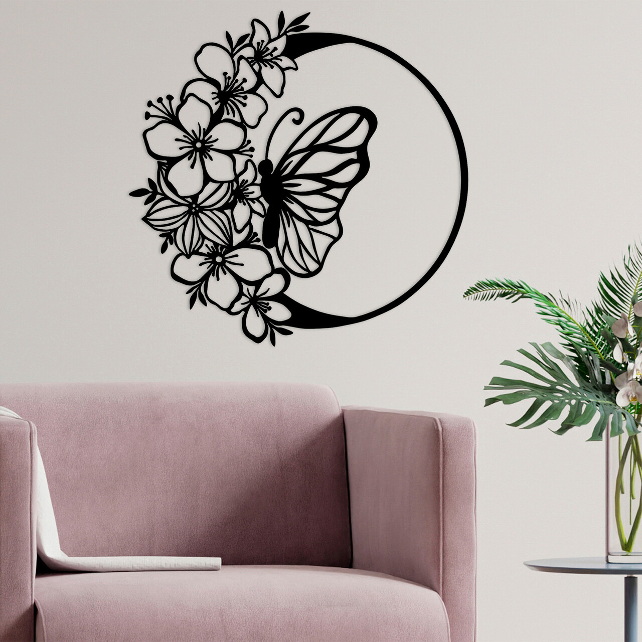 Decoratiune de perete, Butterfly And Flower, Metal, Dimensiune: 69 x 1,5 x 68 cm, Negru
