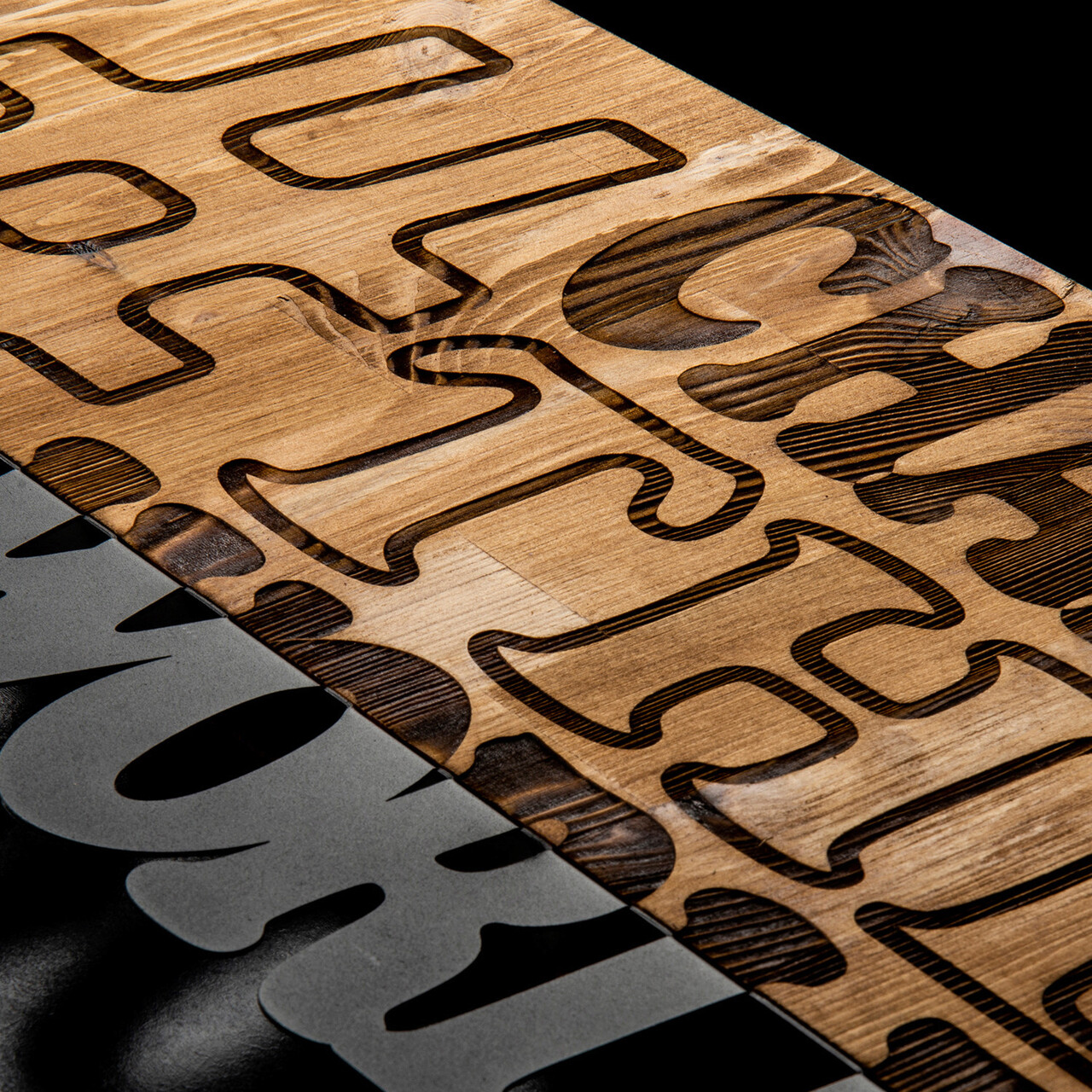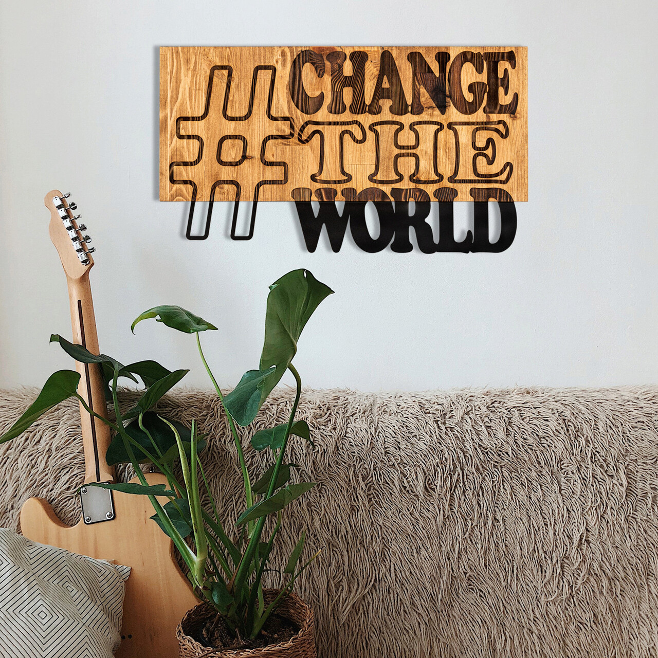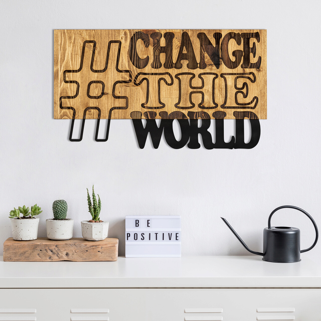 Decoratiune de perete, Change The World, lemn/metal, 58 x 32 cm, negru/maro