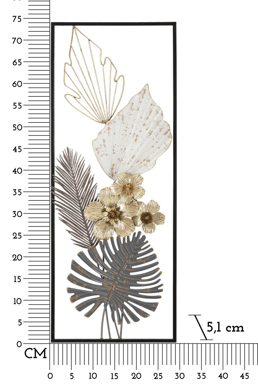 Panou decorativ de perete 3D din fier compus din frunze si flori intr-un cadru dreptunghiular elegant.