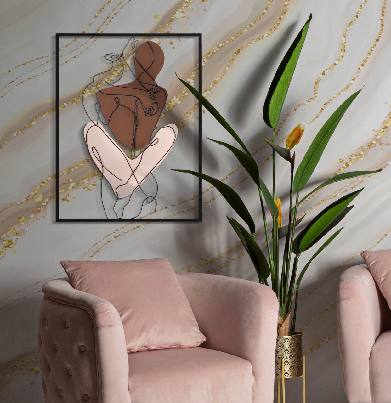 Panoul decorativ de perete din metal 3D cu linii moi care compun imaginea unui cuplu. Impodobit cu insertii colorate care dau luminozitate.