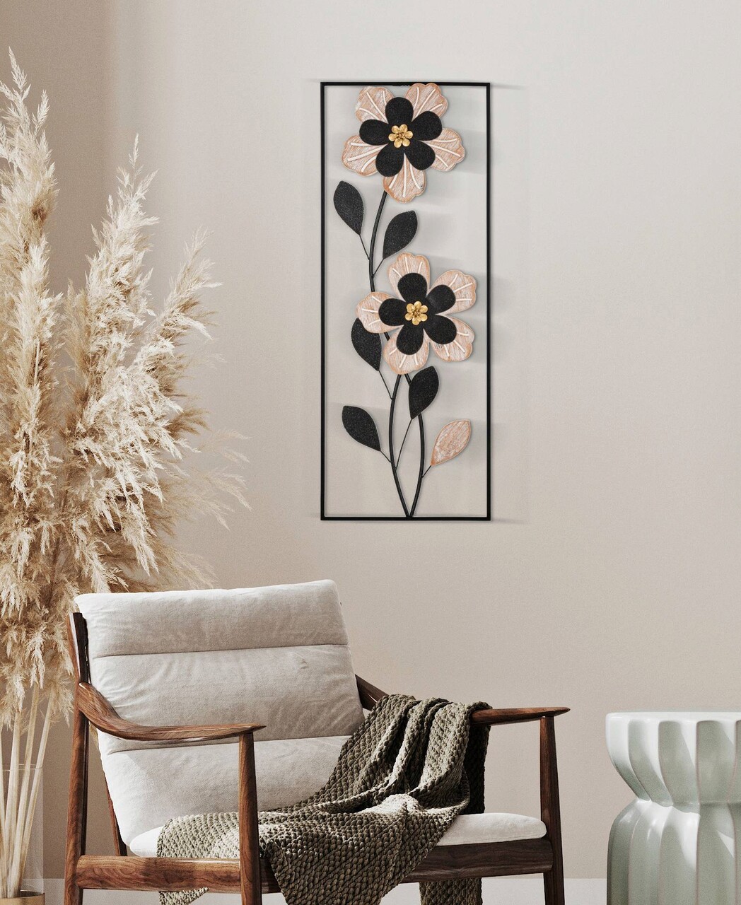 Panou decorativ de perete 3D din fier si MDF, format din flori elegante incadrate intr-un cadru dreptunghiular din lemn.
