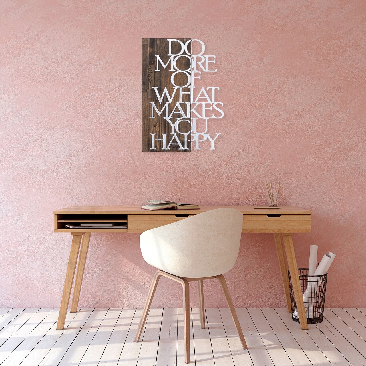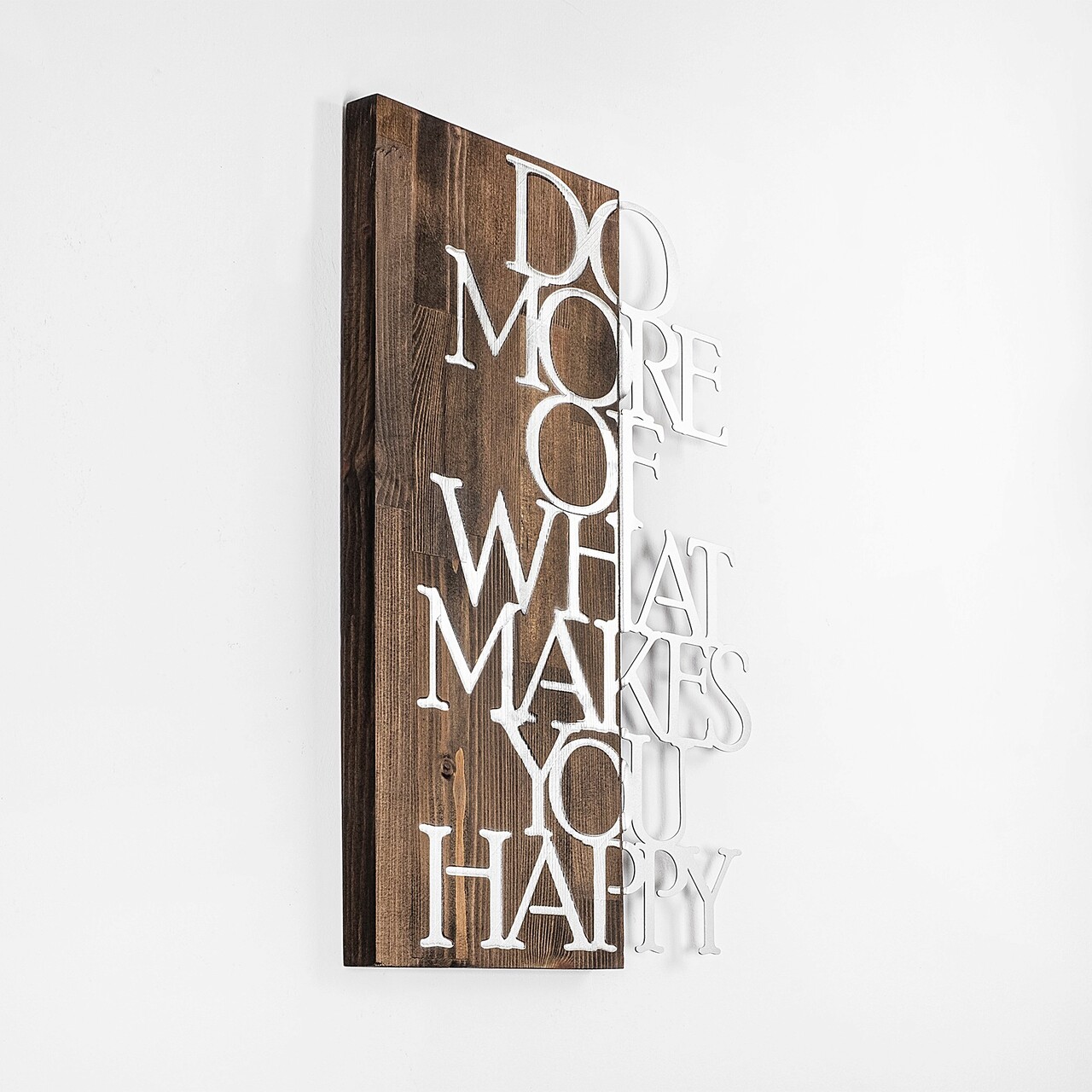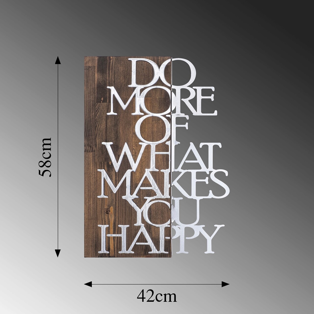 Decoratiune de perete, Do More Of What Makes You Happy, 50% lemn/50% metal, Dimensiune: 42 x 58 cm, Nuc / Argint