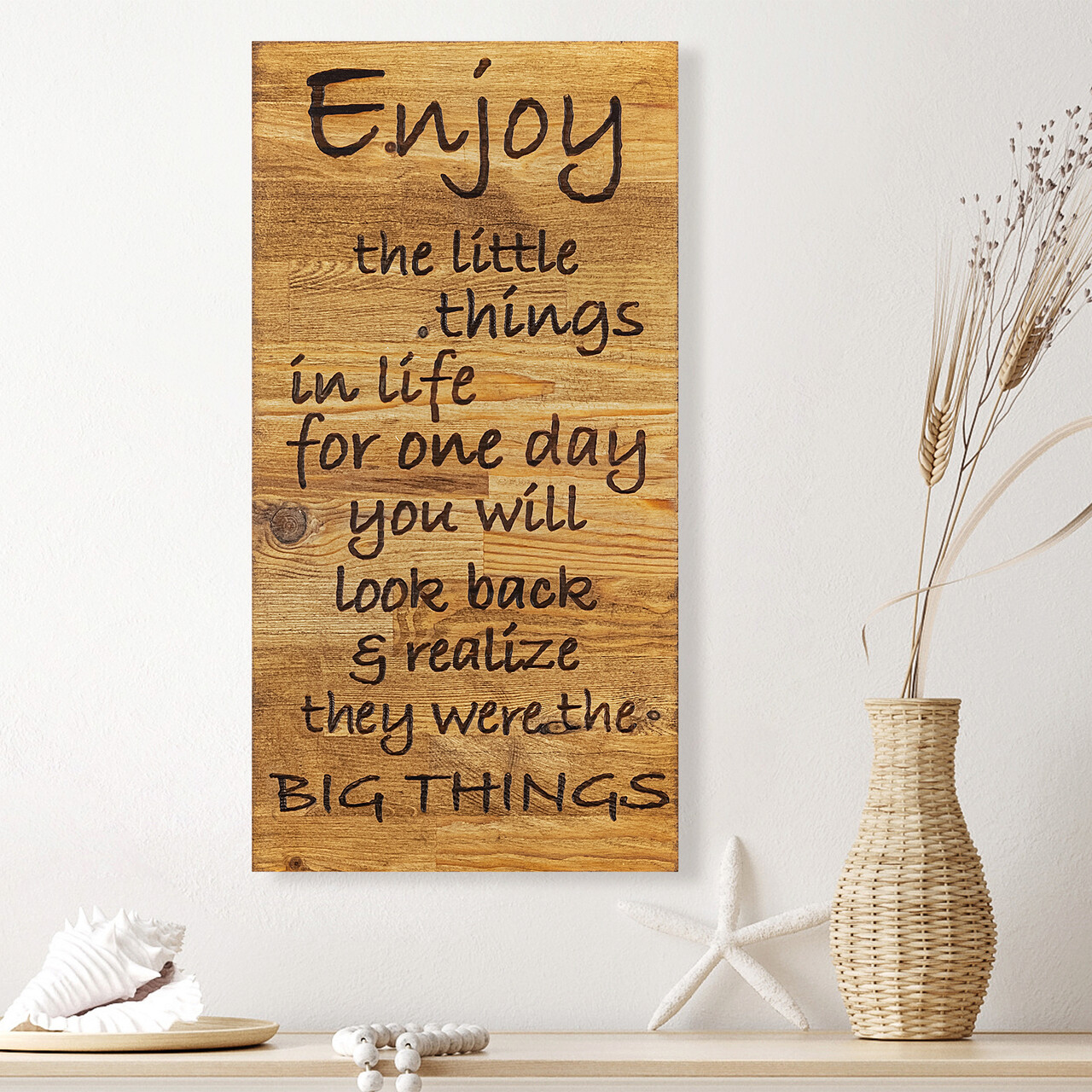 Decoratiune de perete, Enjoy The Little Things, Lemn, Dimensiune: 30 x 3 x 58 cm, Nuc / Negru