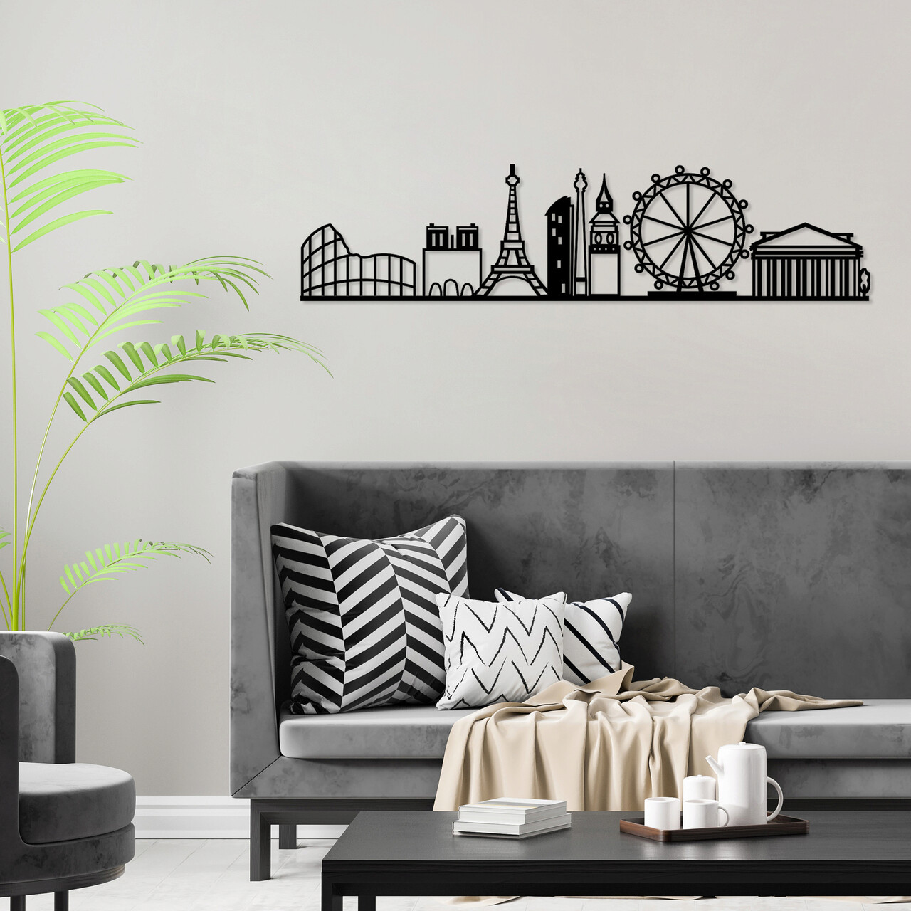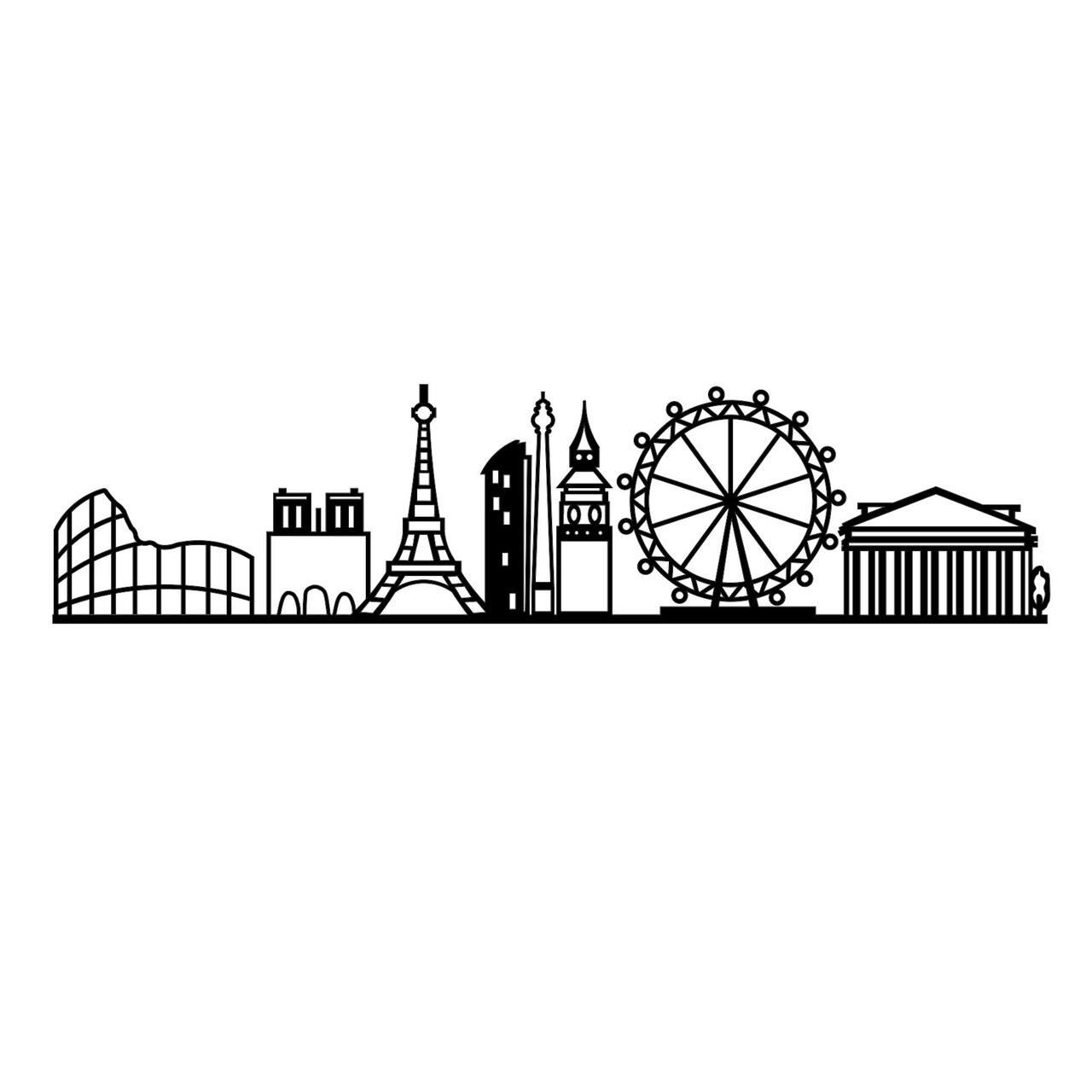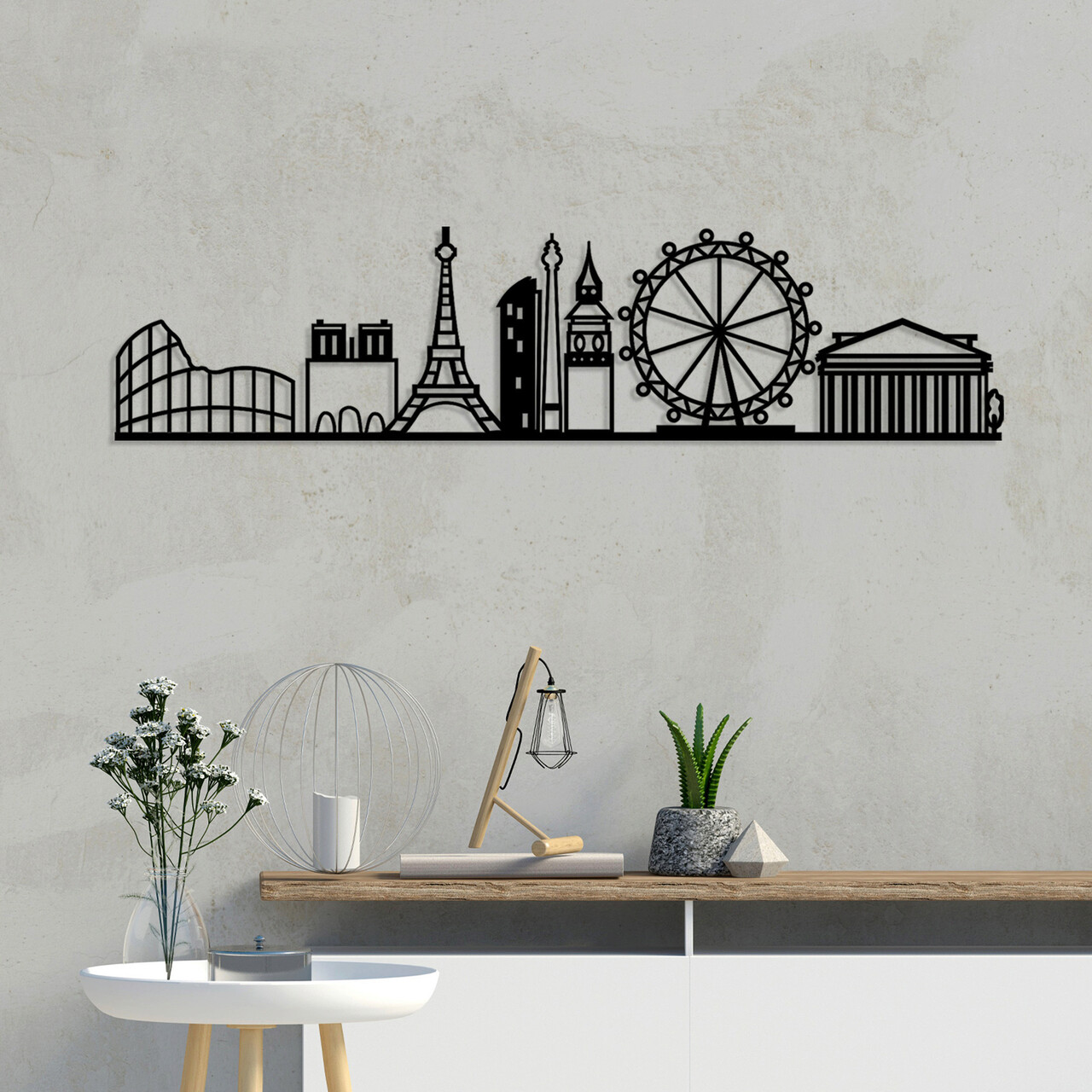 Decoratiune de perete, European Cities Skyline, Metal, Dimensiune: 120 x 29 cm, Negru