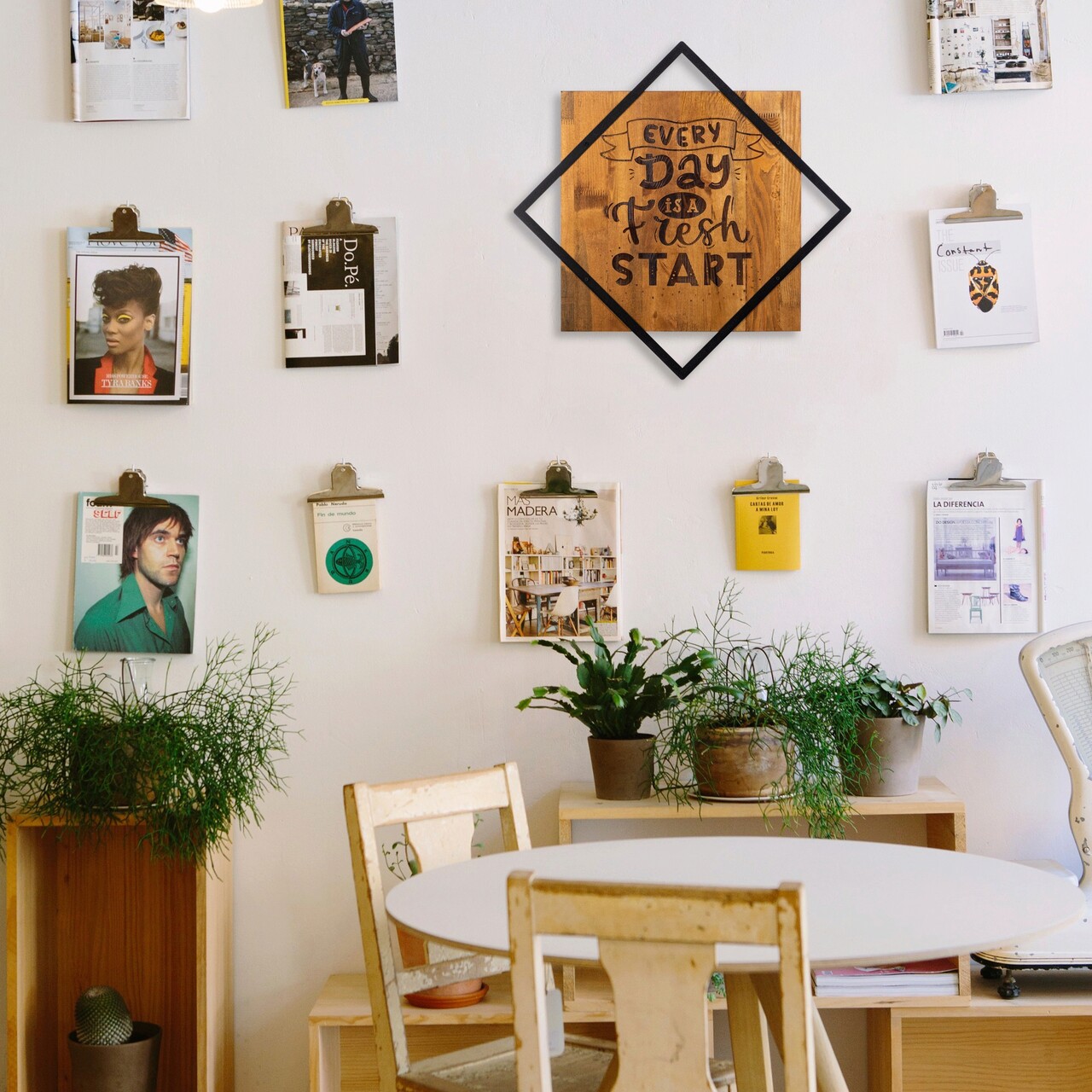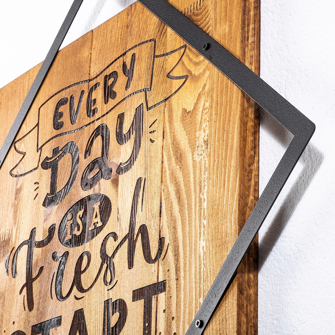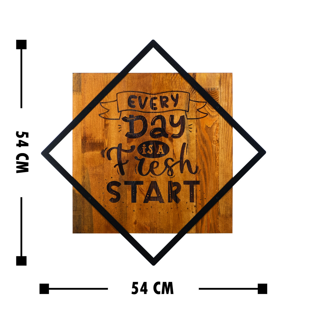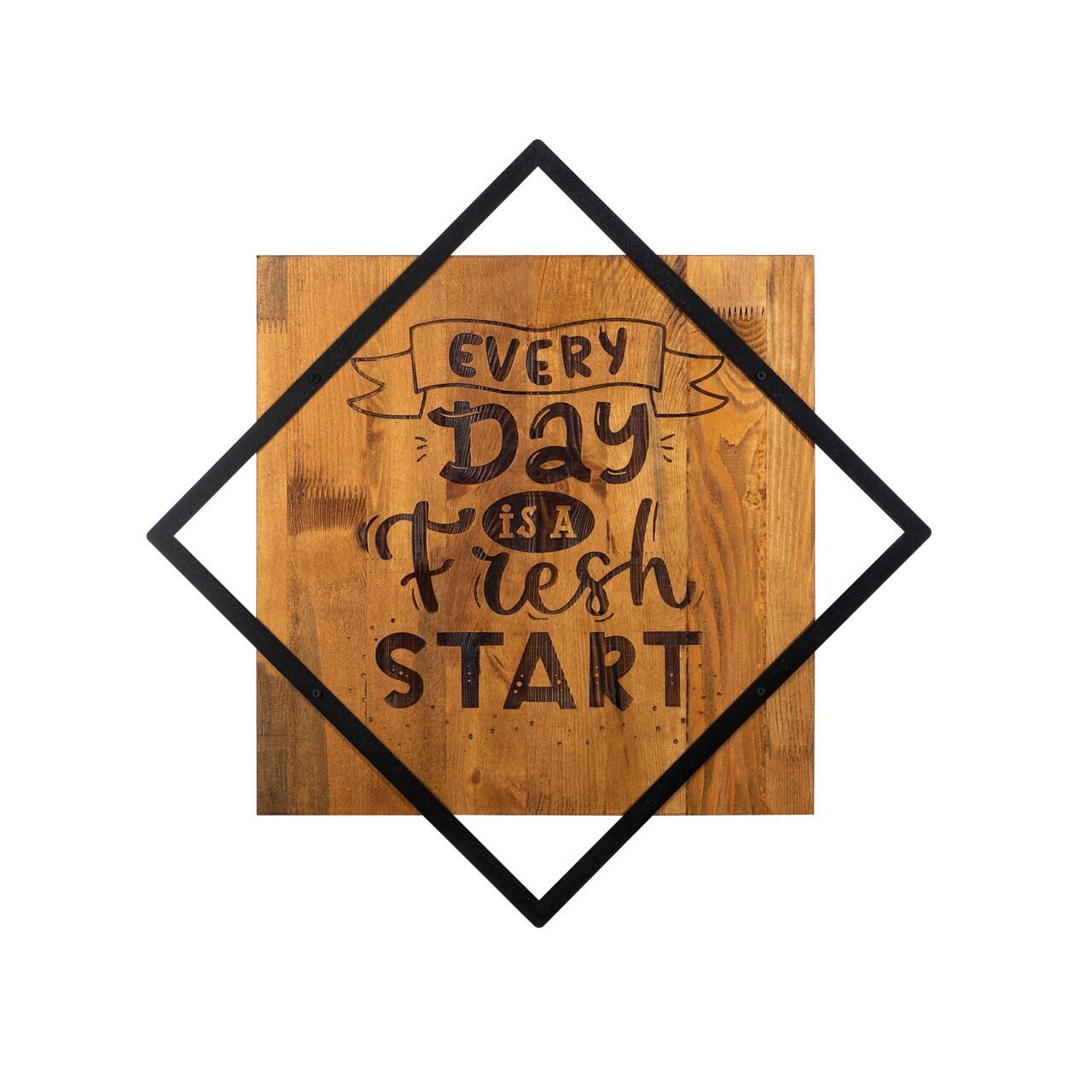 Decoratiune de perete, Every Day İs A Fresh Start, 50% lemn/50% metal, Dimensiune: 54 x 54 cm, Nuc / Negru