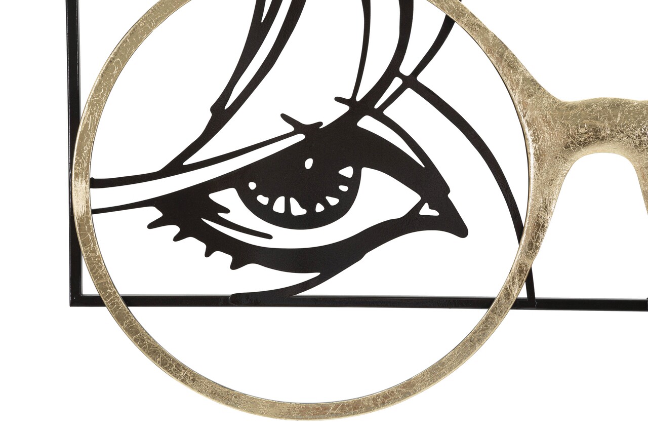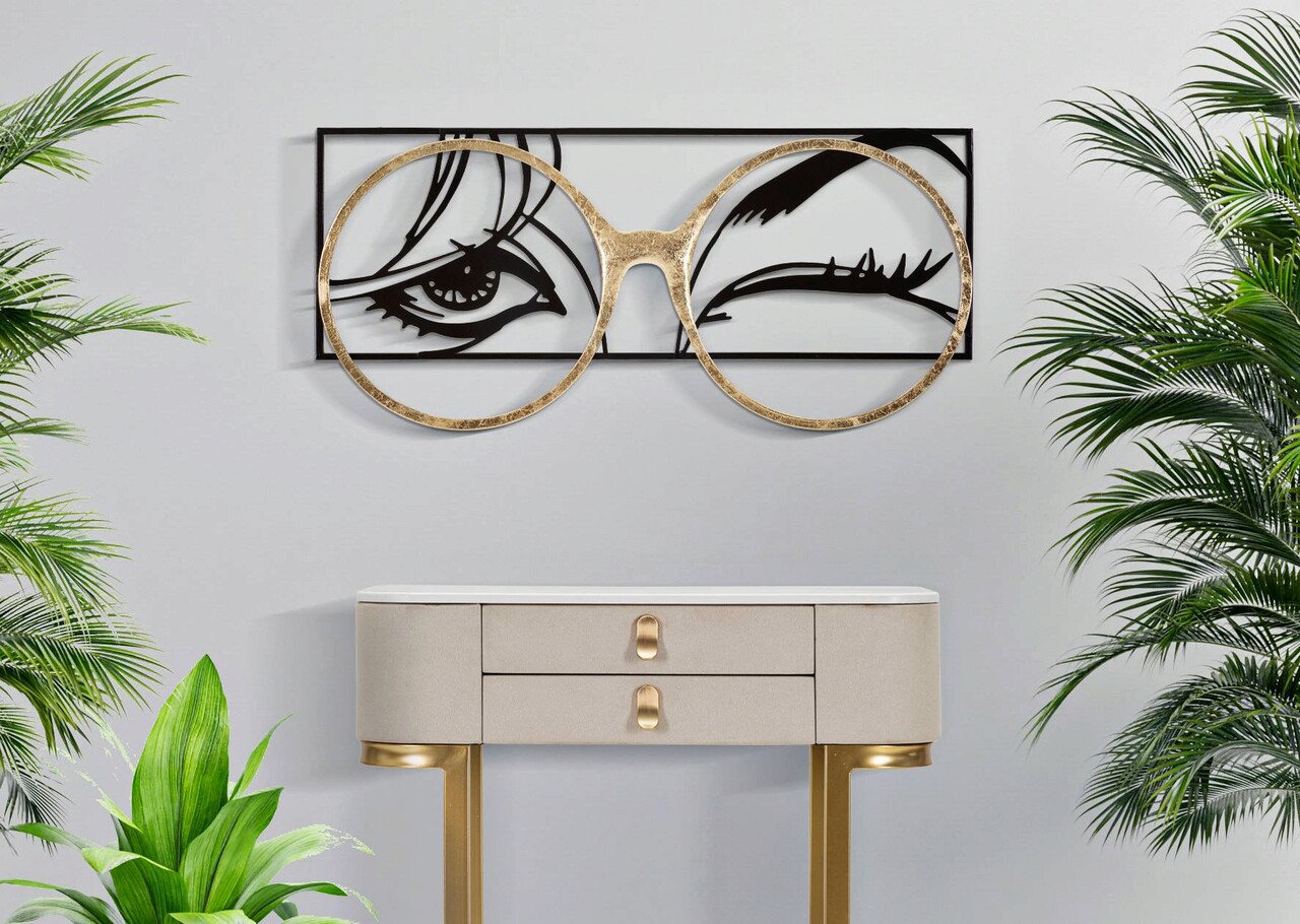Panoul decorativ de perete 3D care ilustreaza o fata cu ochelari din fier auriu.