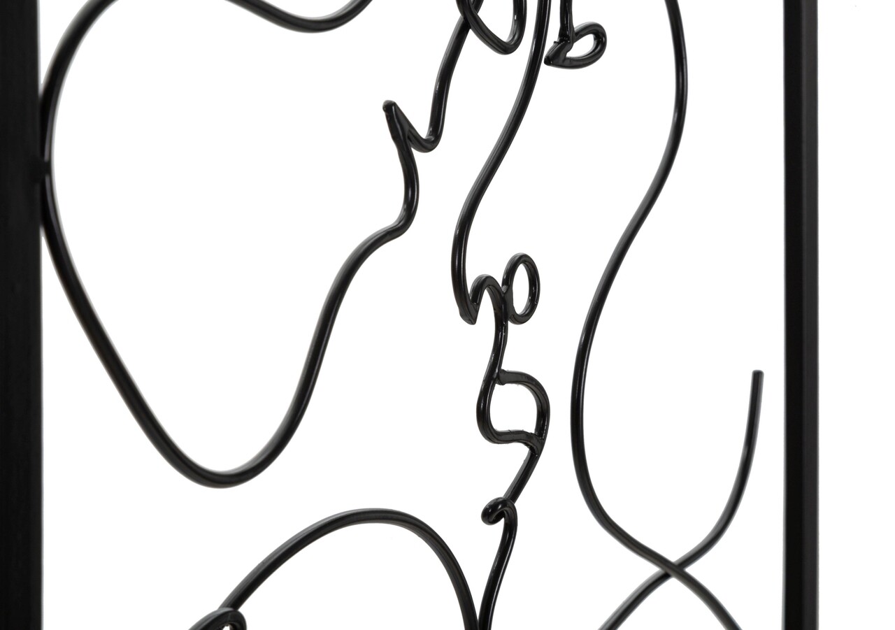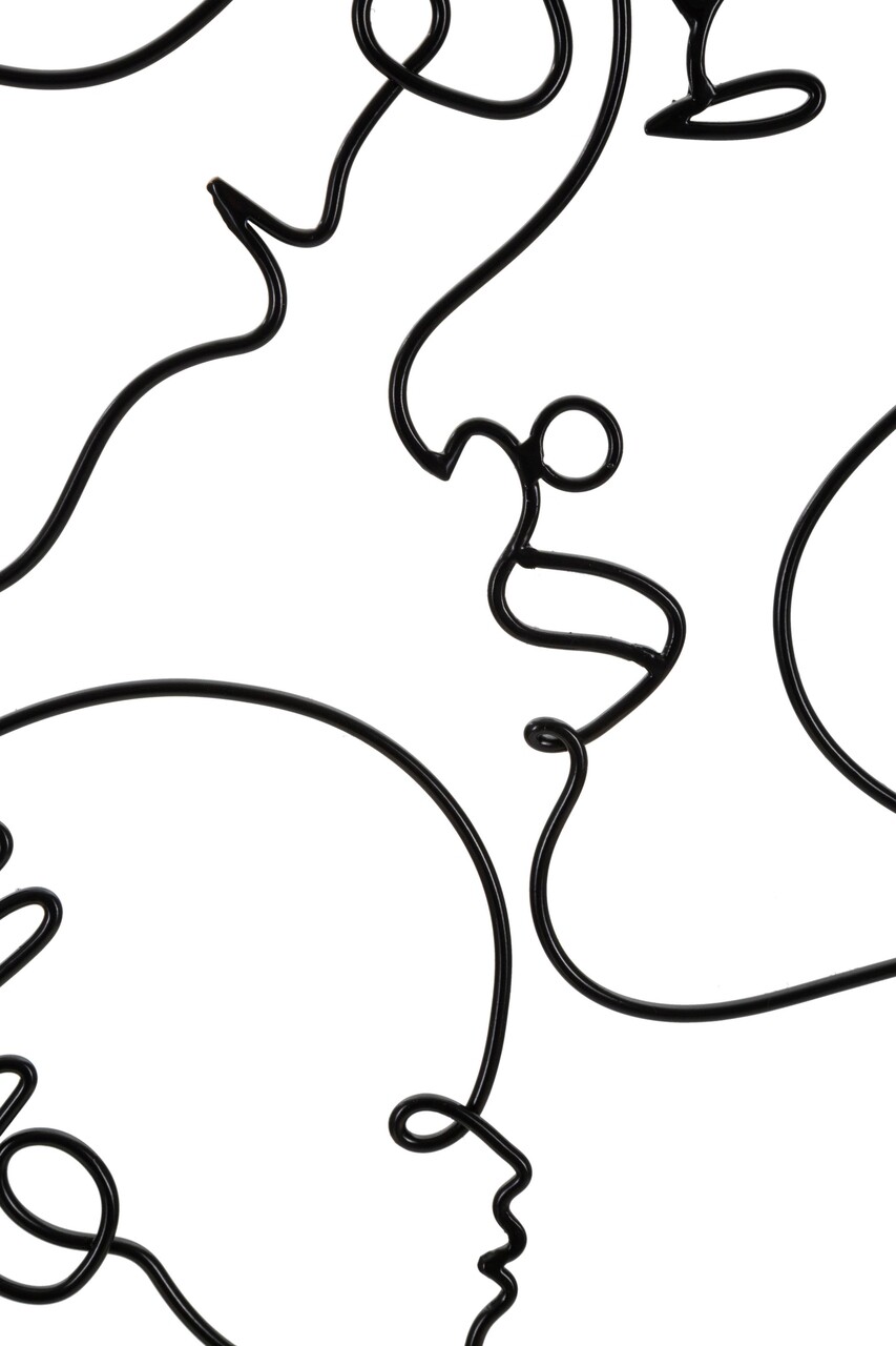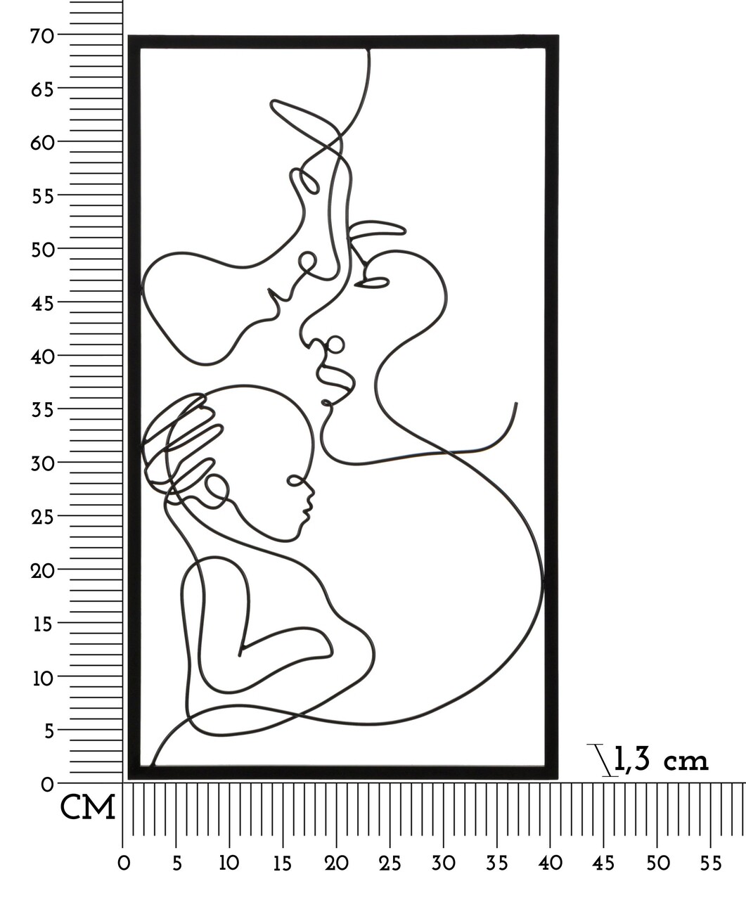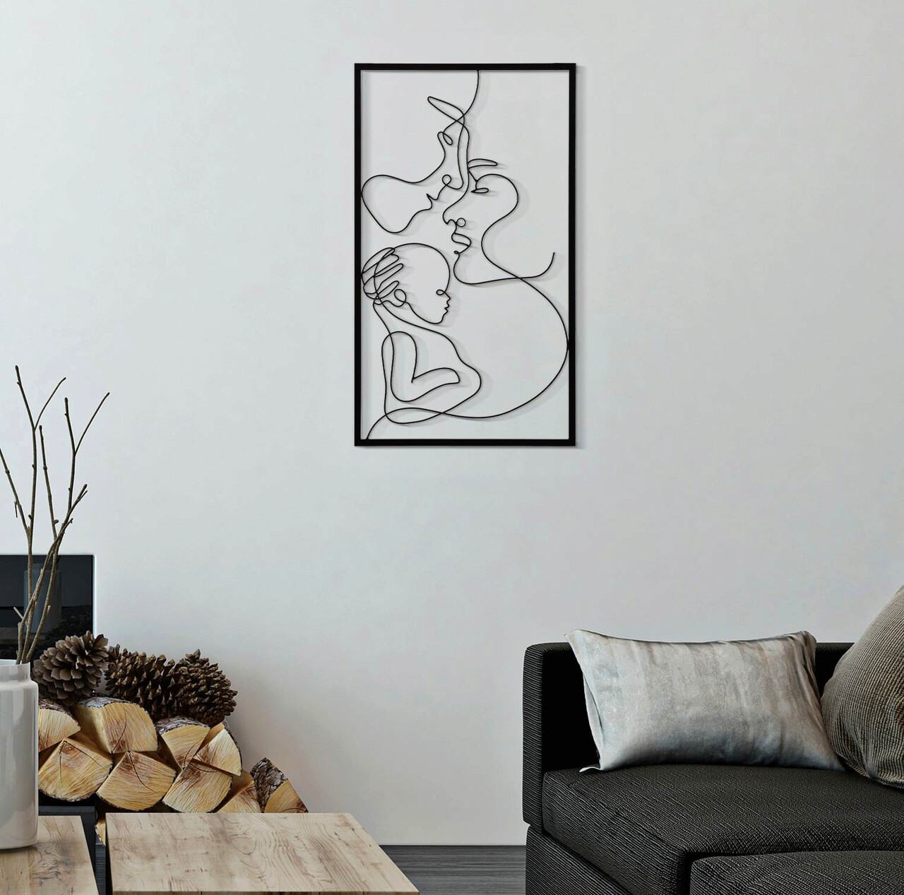 Panou decorativ de perete 3D din metal negru cu trasaturi delicate si sinuoase care compun chipurile unui cuplu cu un copil in brate.