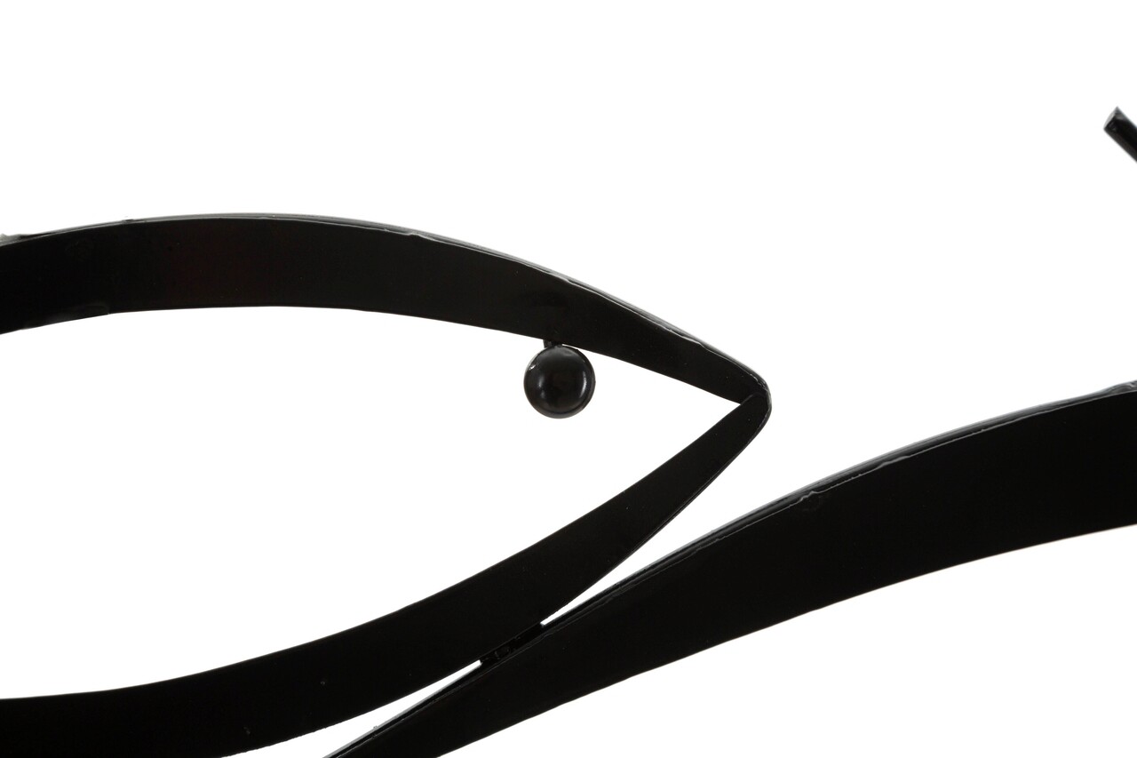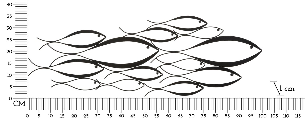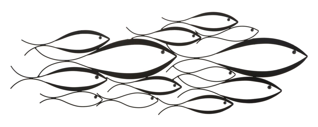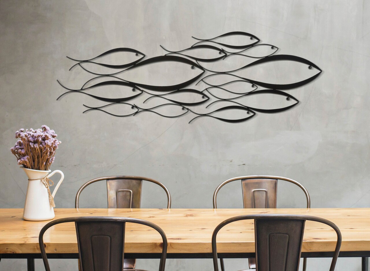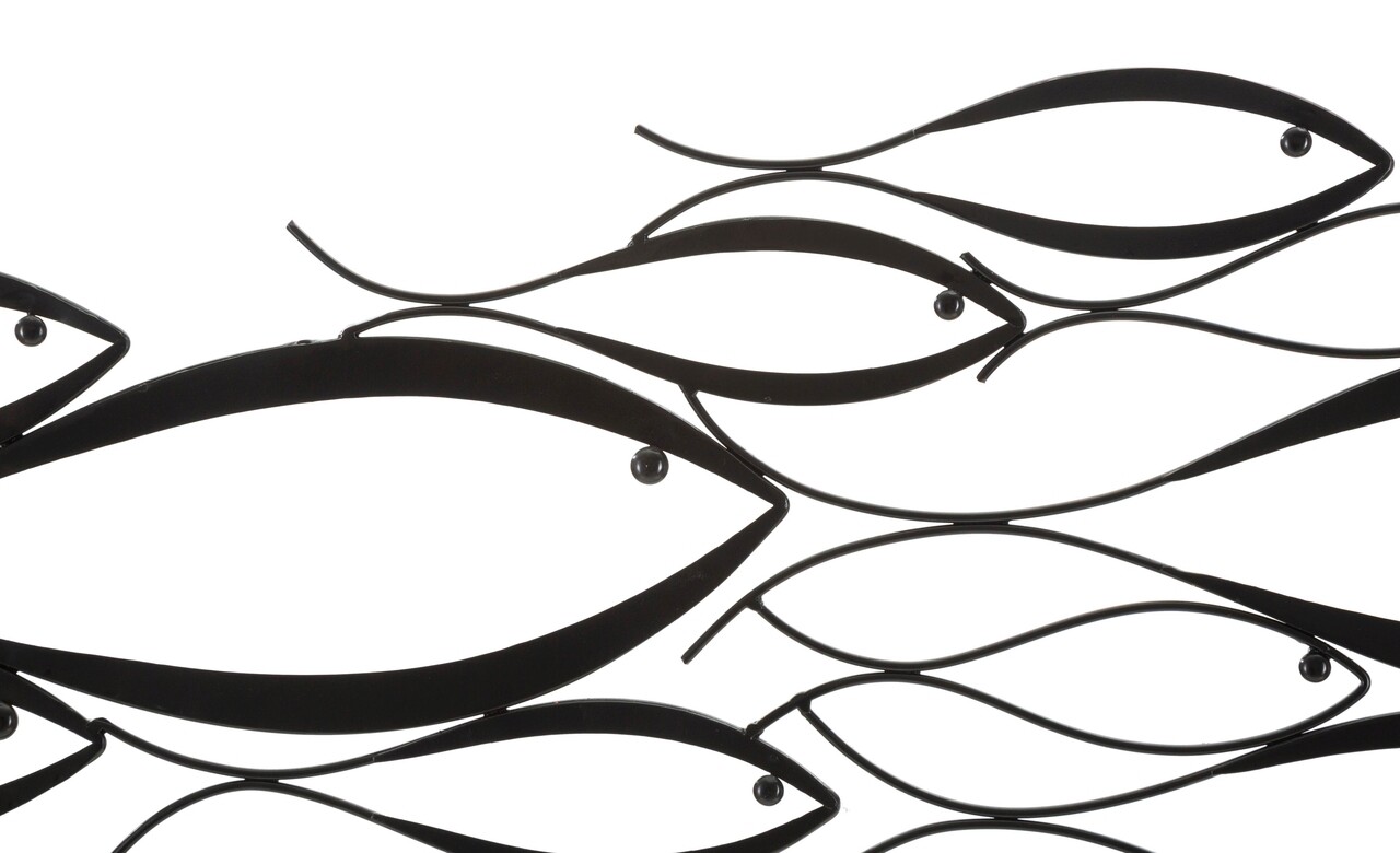 Panou decorativ de perete 3D din metal negru compus dintr-un ansamblu de pesti stilizati de diferite dimensiuni.