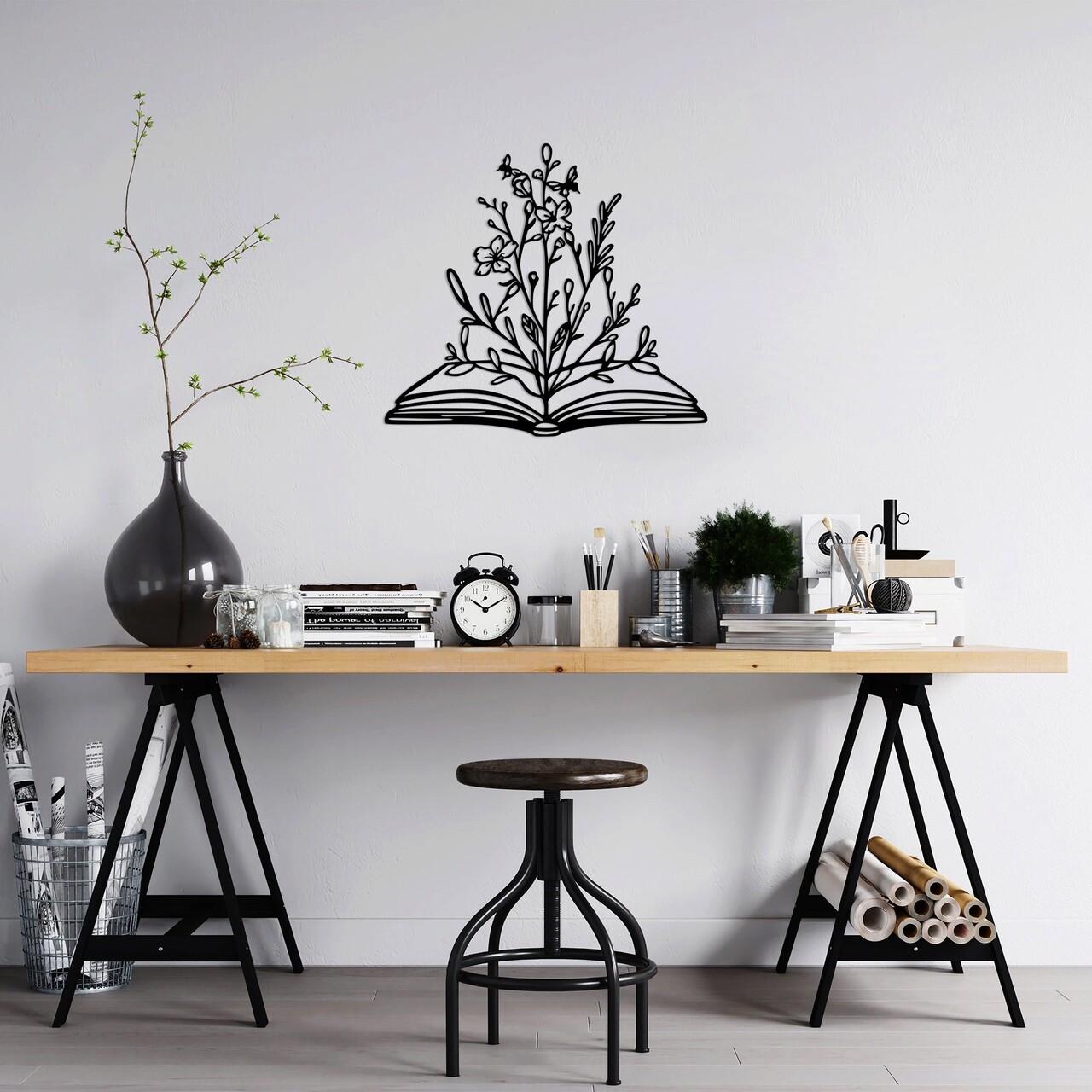 Decoratiune de perete, Flower In Book, Metal, Dimensiune: 70 x 64 cm, Negru