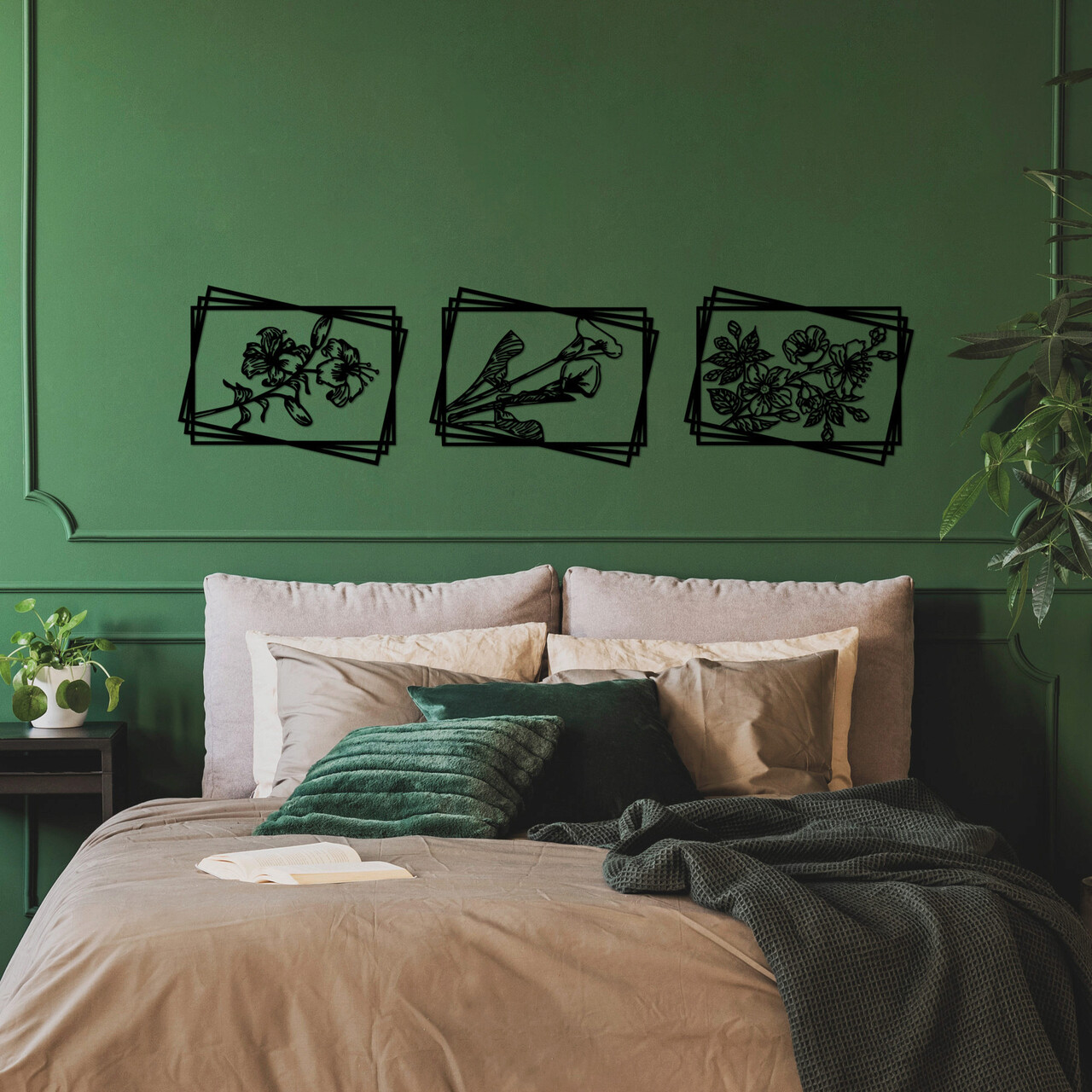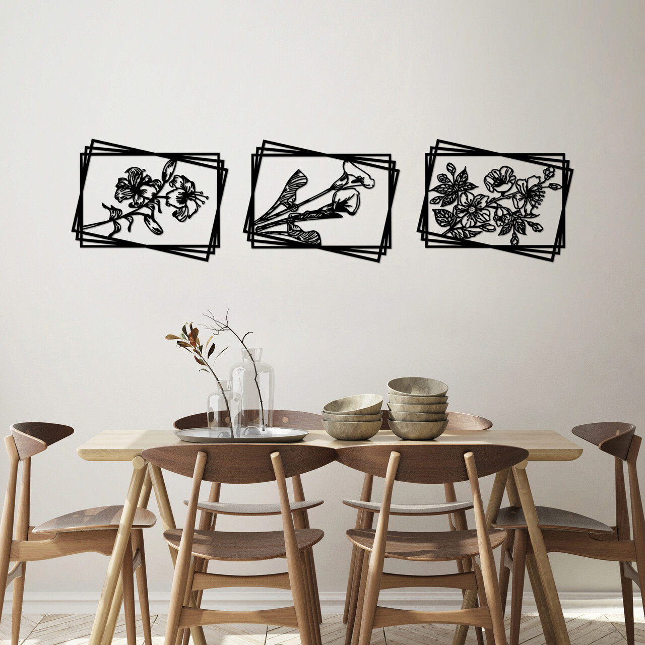 Decoratiune de perete, Flowers 2, Metal, 60 x 47 cm, 3 piese, Negru