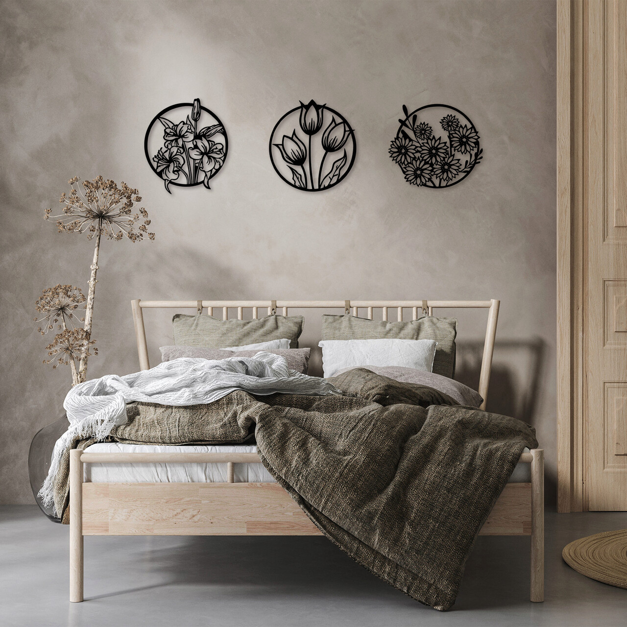 Decoratiune de perete, Flowers, Metal, 50 x 57 cm, 3 piese, Negru