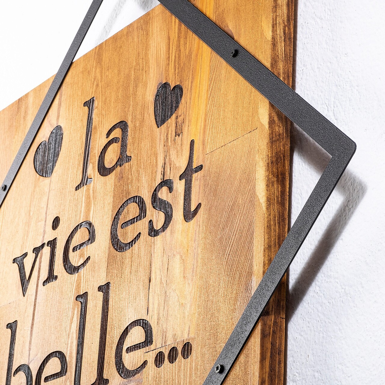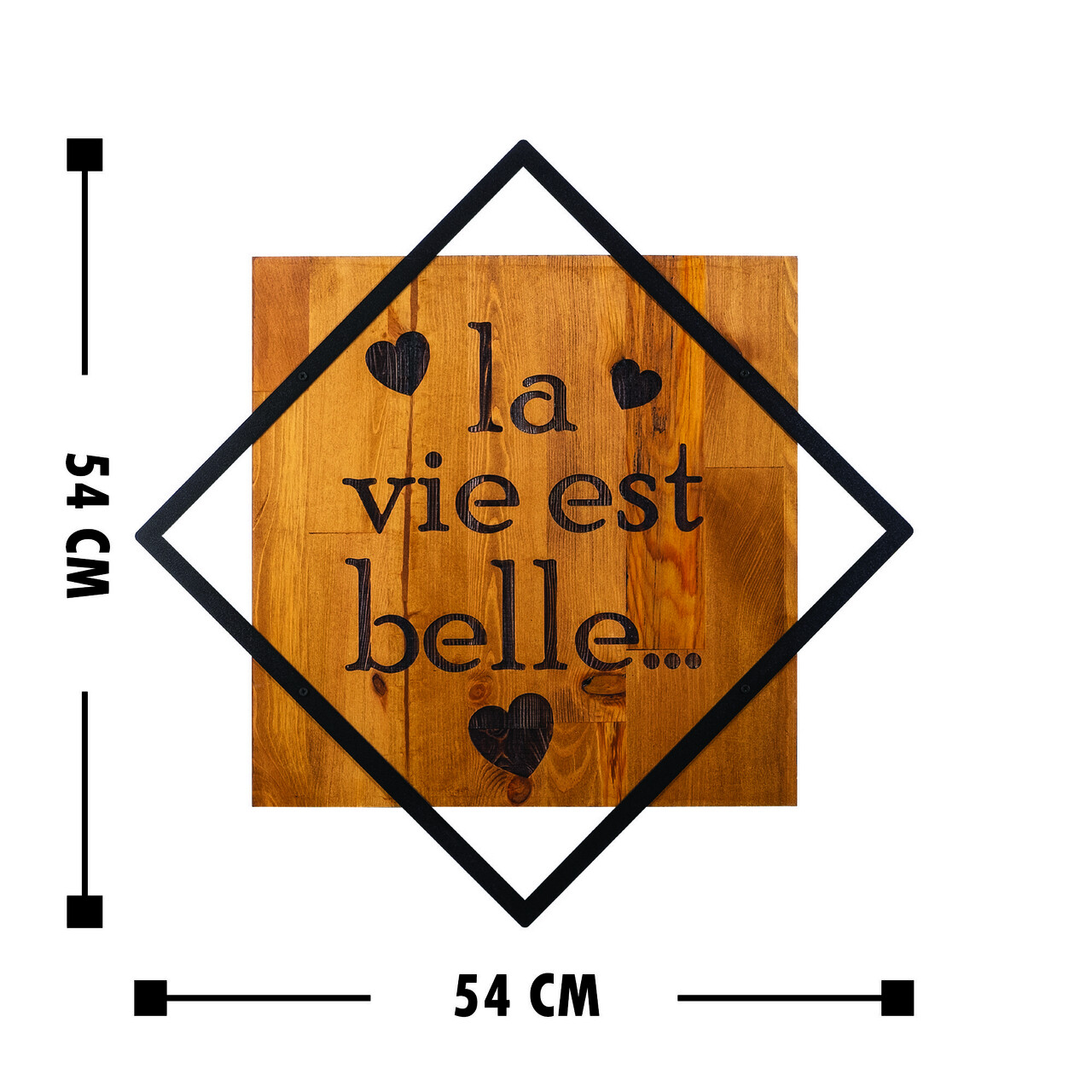 Decoratiune de perete, La Vie Est Belle, 50% lemn/50% metal, Dimensiune: 54 x 54 cm, Nuc / Negru