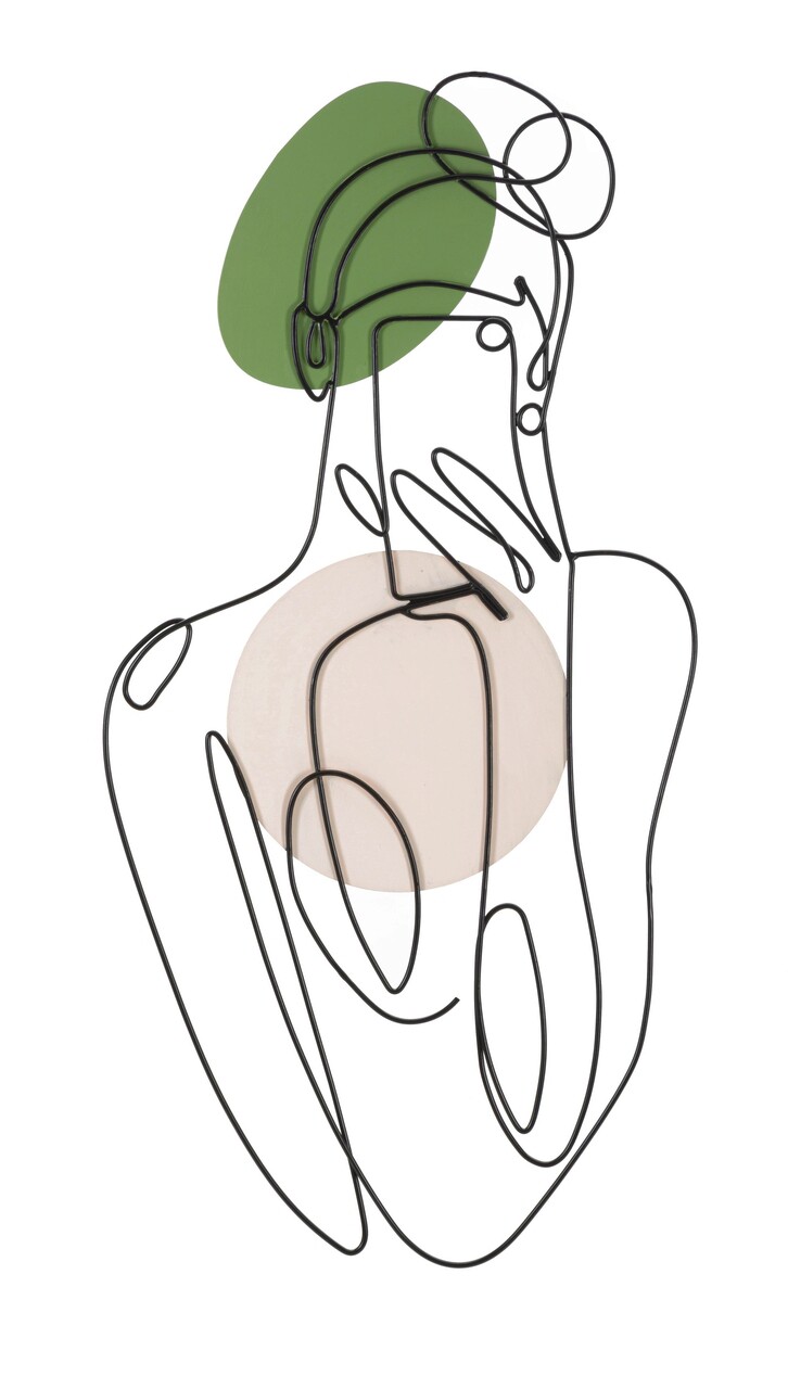 Panoul decorativ de perete 3D din metal negru cu trasaturi delicate care compun figura unei fete cu telefonul mobil. Impodobit cu parti colorate care dau luminozitate.