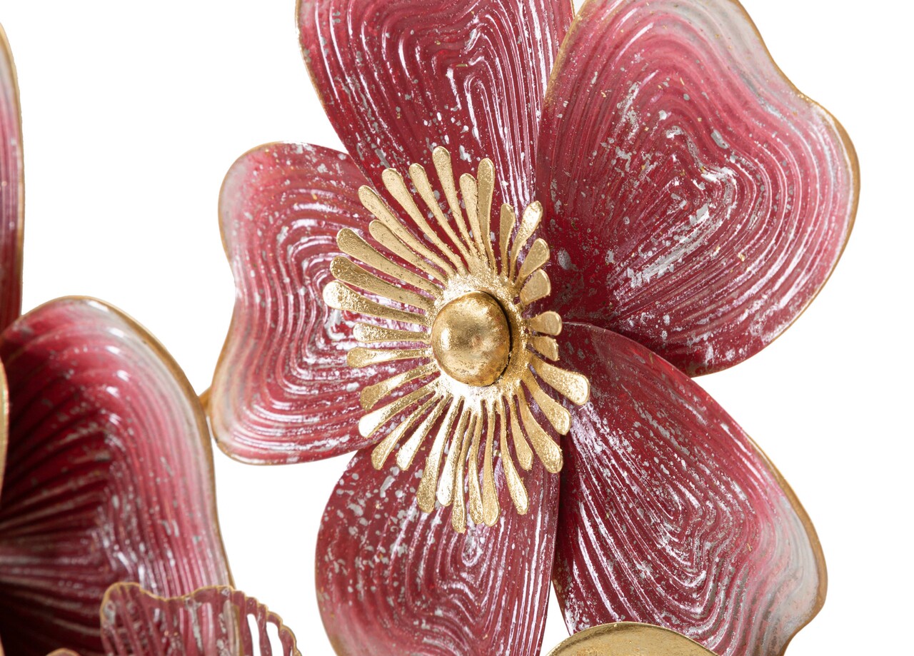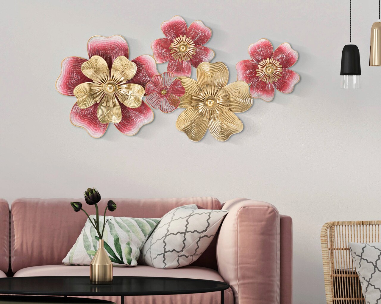 Panou decorativ de perete 3D din fier compus din flori aurii si colorate.
