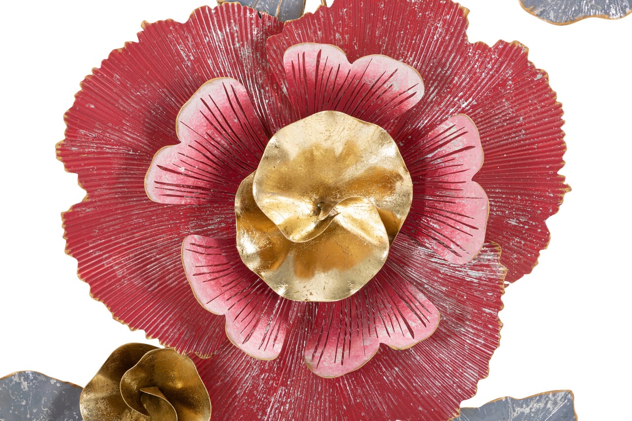 Panou decorativ de perete 3D din fier reprezentand o floare si frunze viu colorate.
