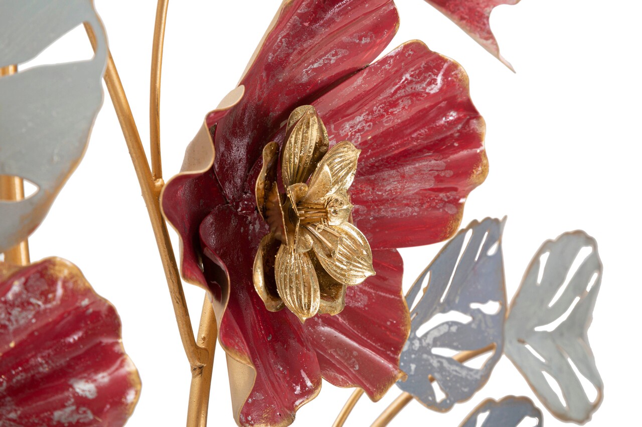 Panou decorativ de perete 3D din fier reprezentand flori si frunze viu colorate.