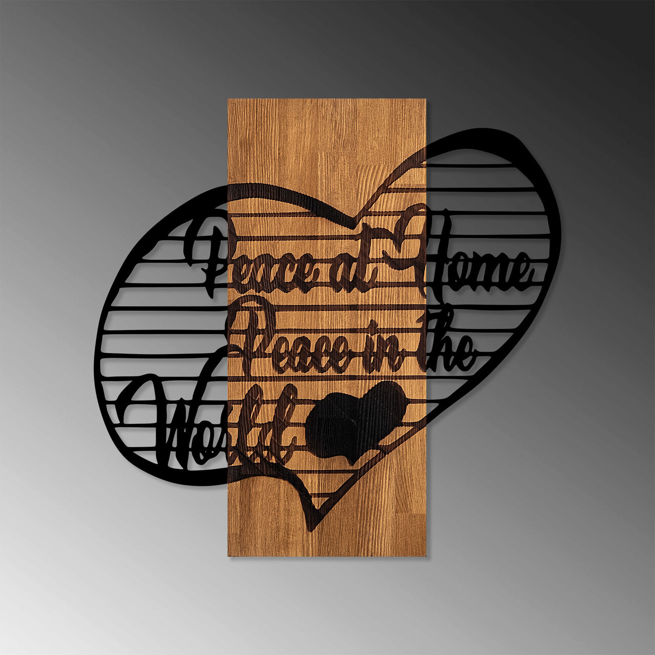 Decoratiune de perete, Peace At Home Peace in The World 1, 50% lemn/50% metal, Dimensiune: 59 x 58 cm, Nuc / Negru