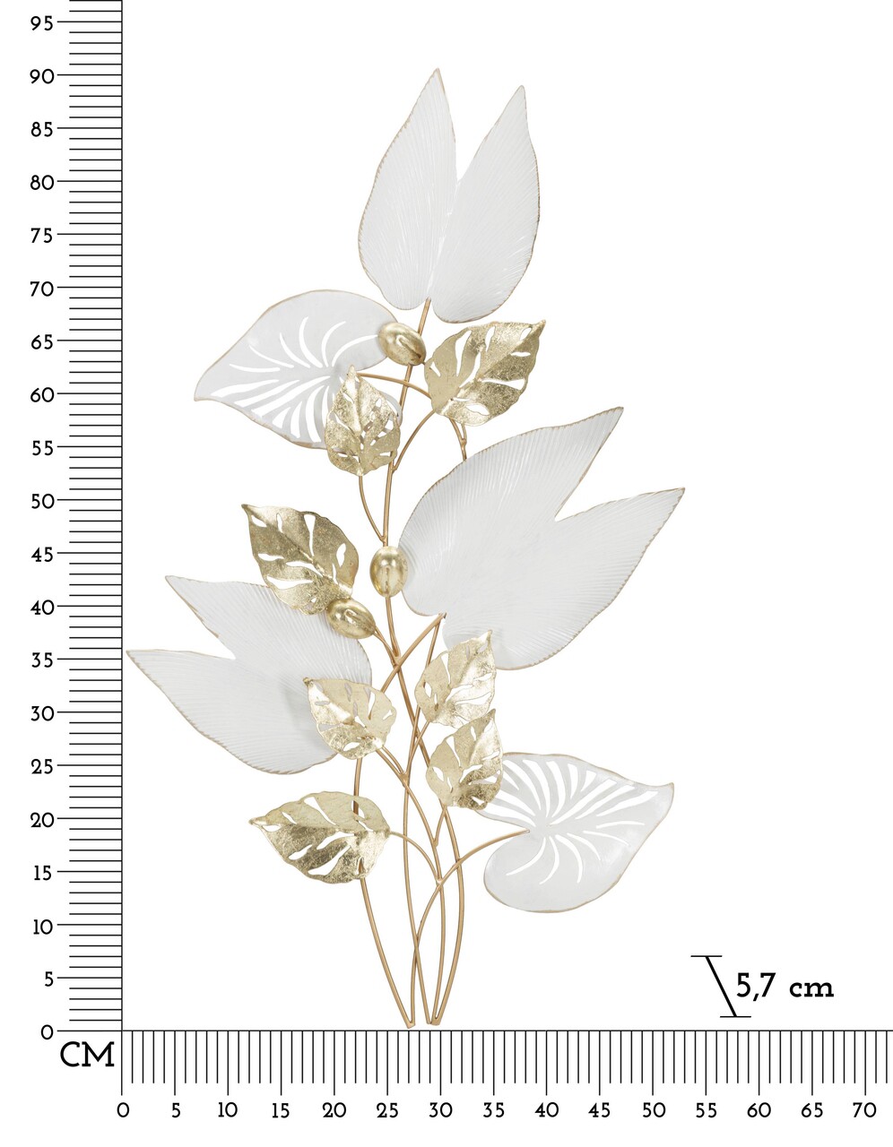Panou decorativ de perete 3D din fier compus din ramuri cu frunze albe si aurii.