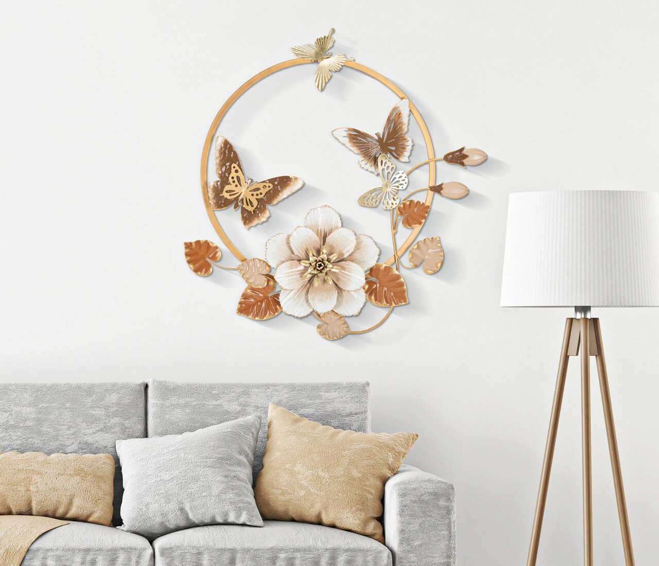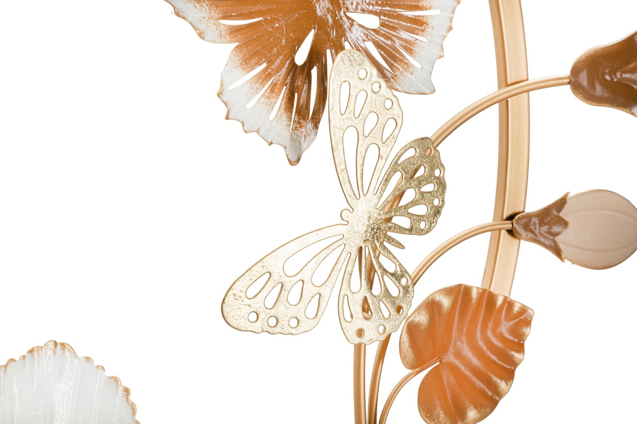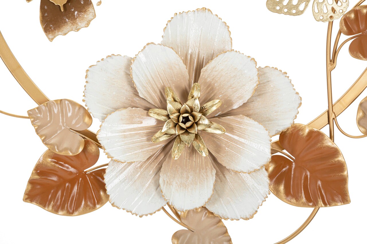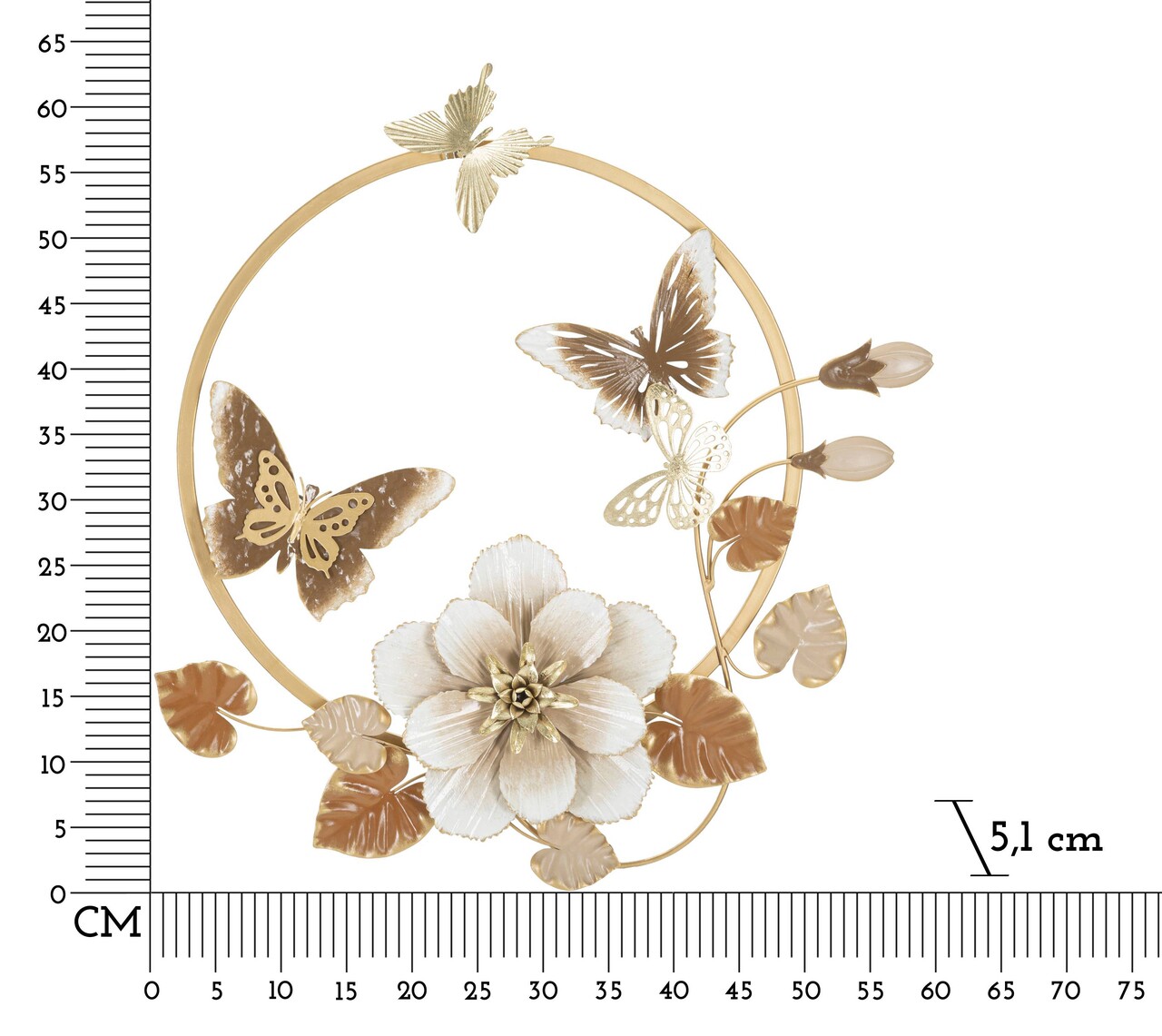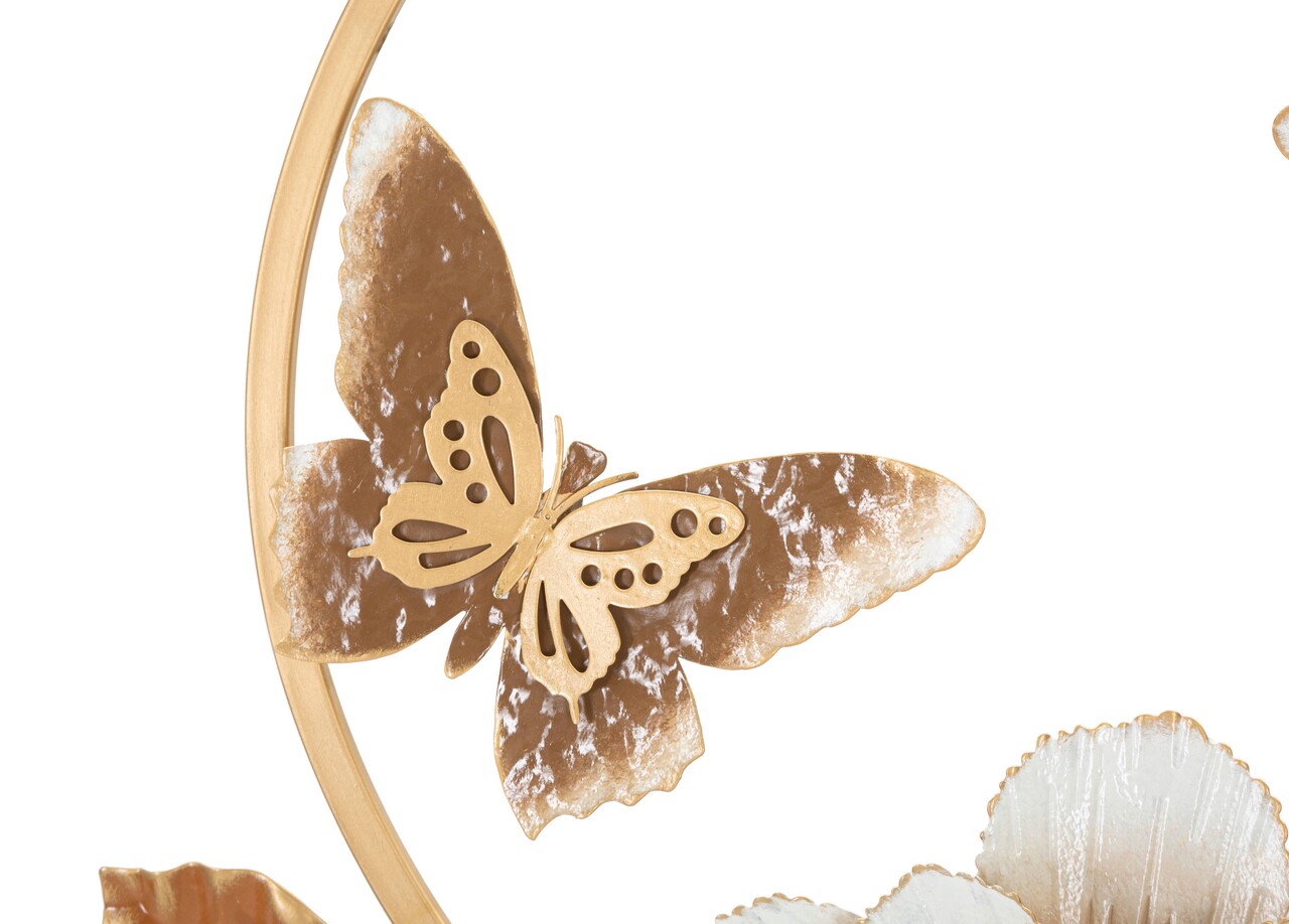 Panou decorativ de perete 3D din fier auriu compus din flori, frunze si fluturi intr-o structura circulara.