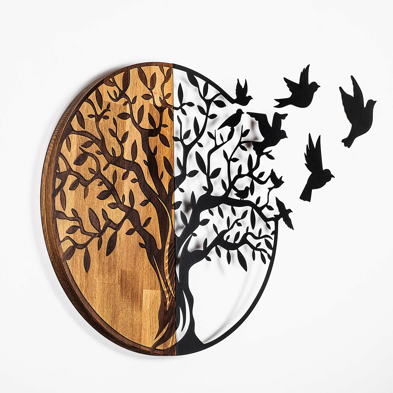 Decoratiune de perete, Tree And Birds, 50% lemn/50% metal, 92 x 3 x 71 cm, Nuc negru