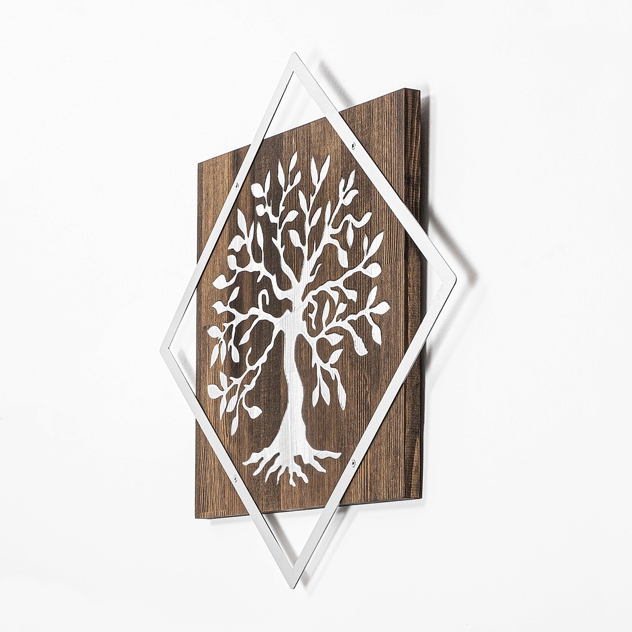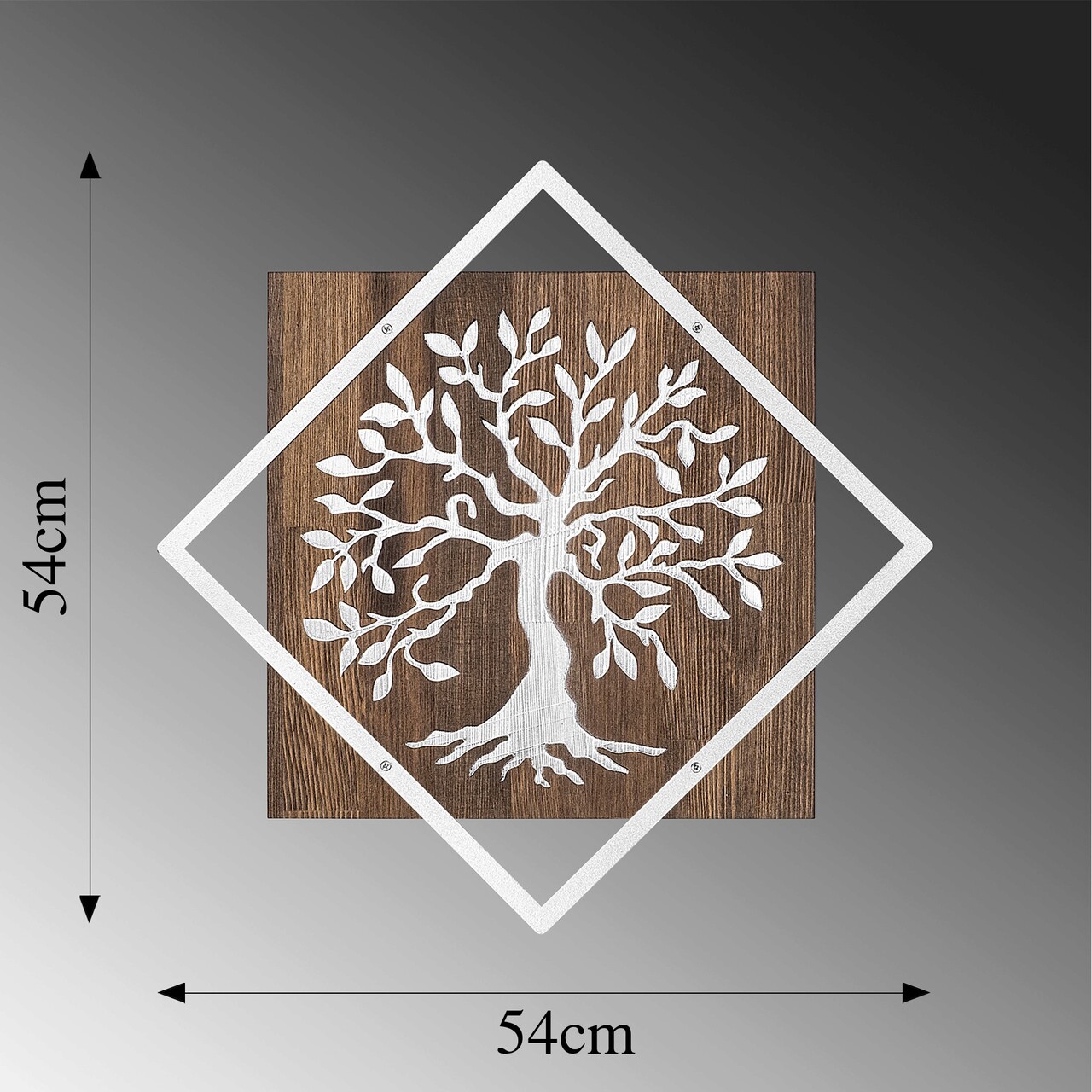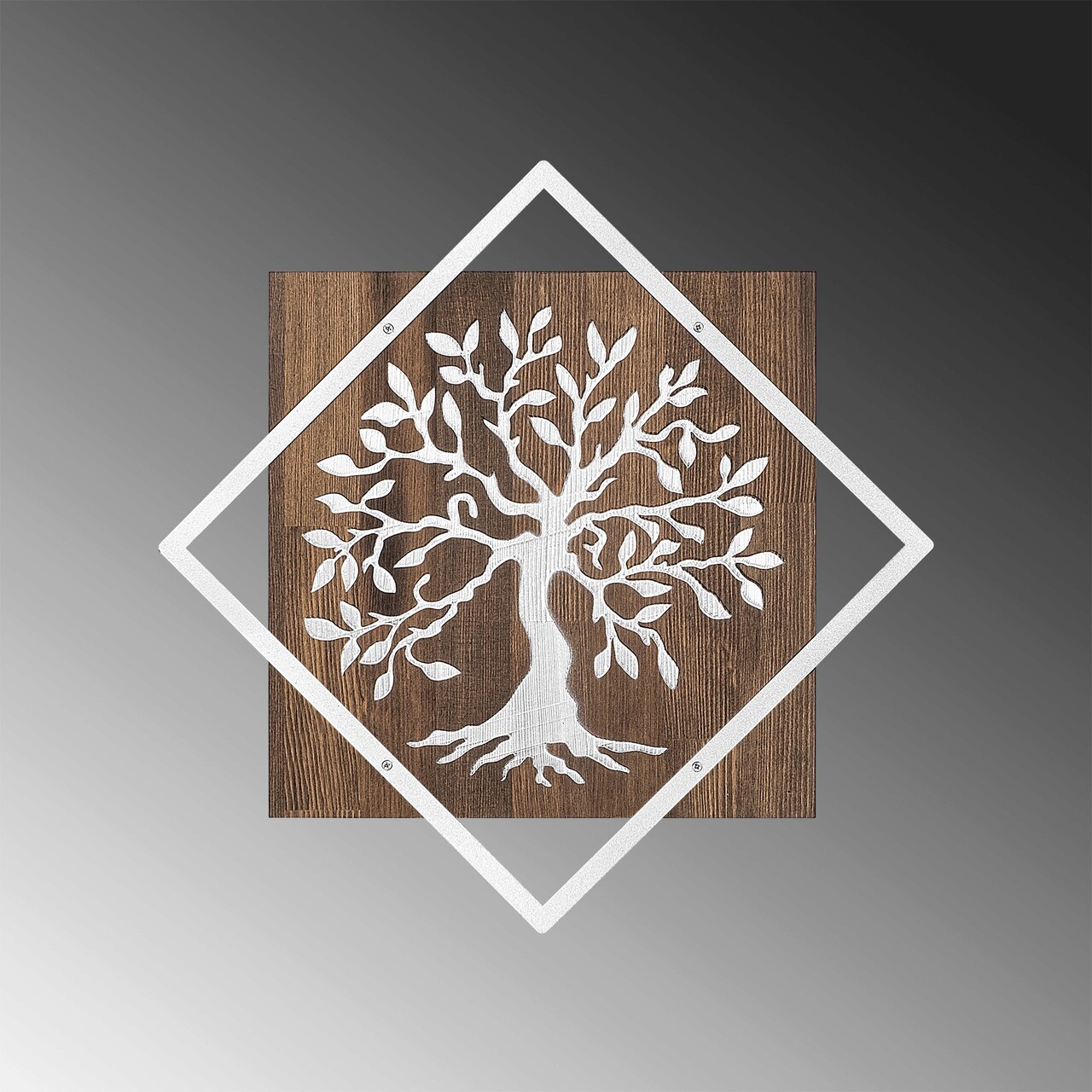 Decoratiune de perete, Tree v2, 50% lemn/50% metal, Dimensiune: 54 x 54 cm, Nuc / Argint