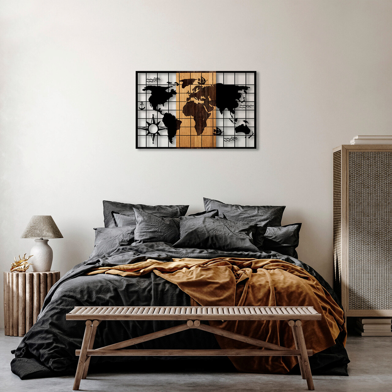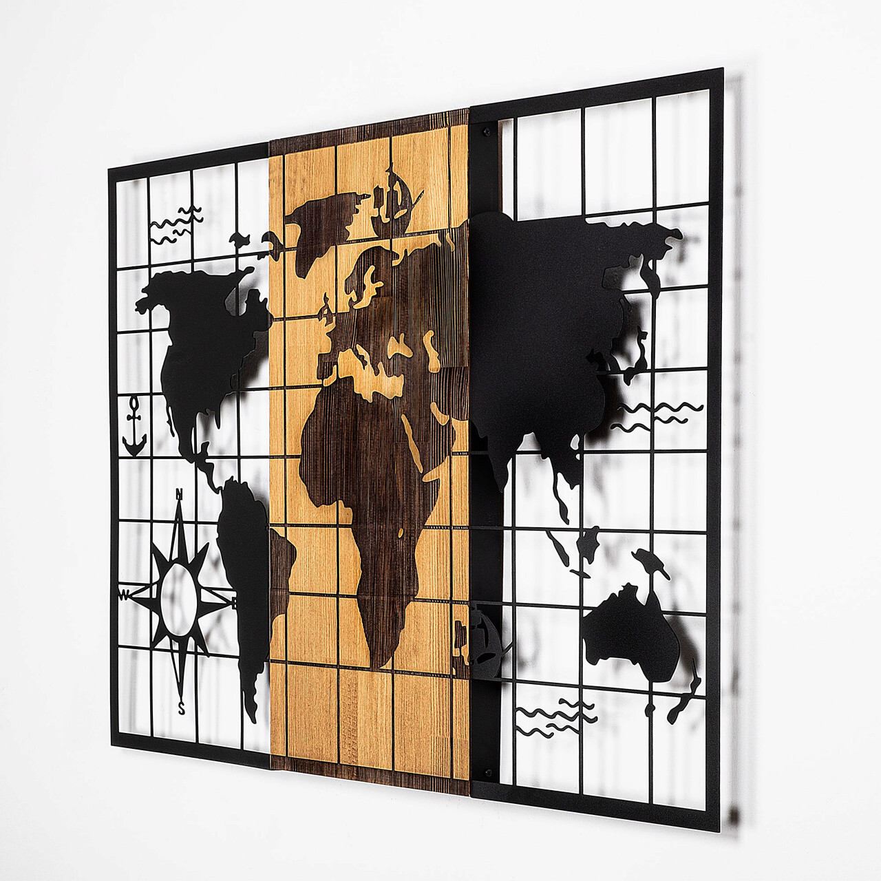 Decoratiune de perete, World Map, 50% lemn/50% metal, Dimensiune: 90 x 3 x 58 cm, Nuc negru