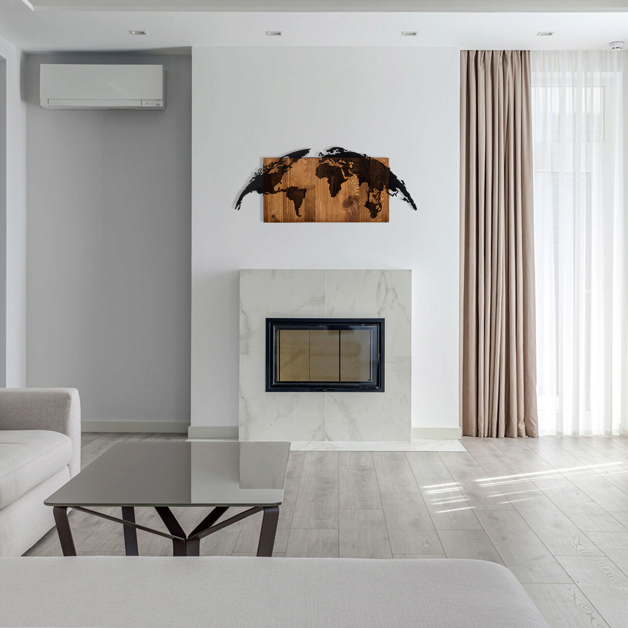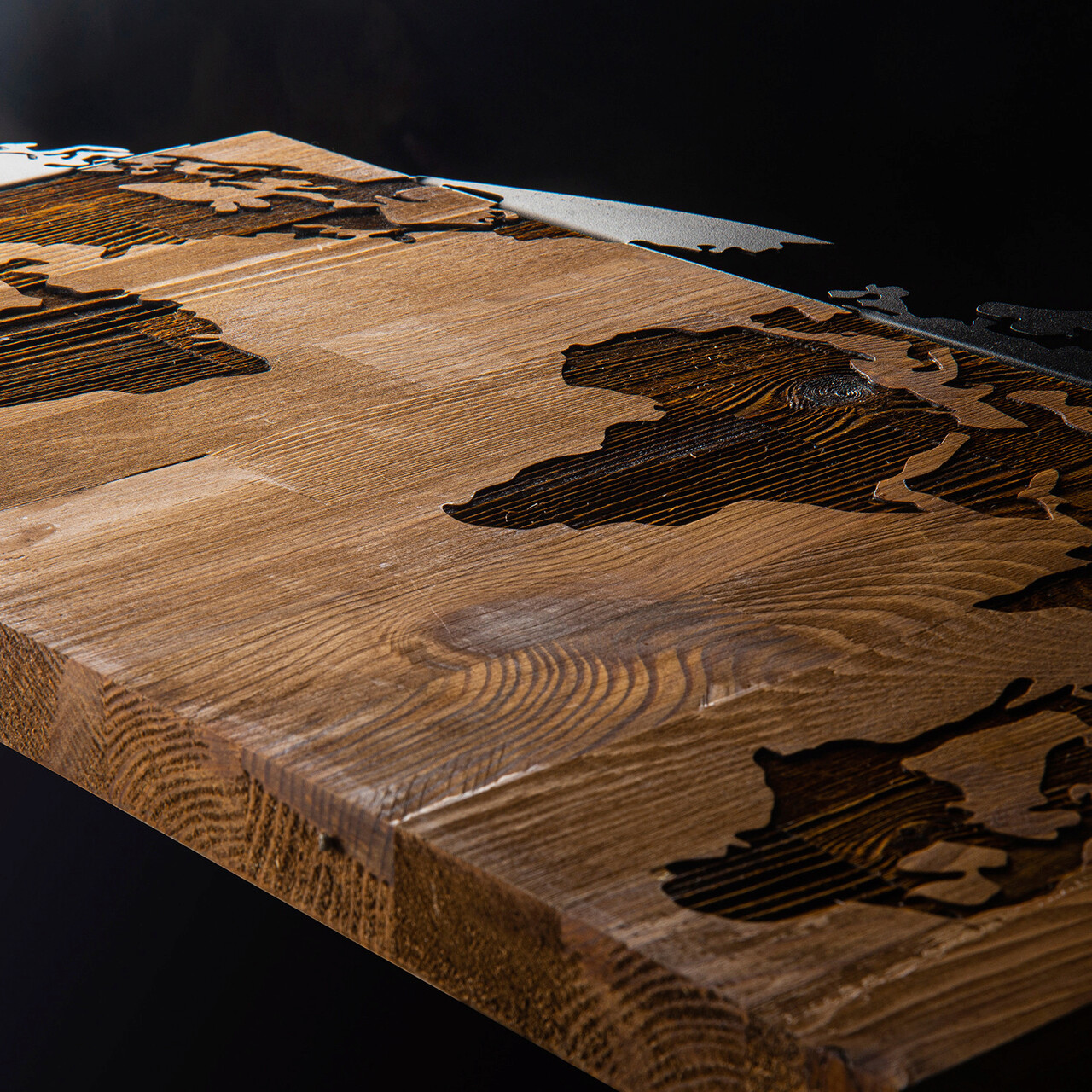 Decoratiune de perete, World Map, lemn/metal, 83 x 35 cm, negru/maro