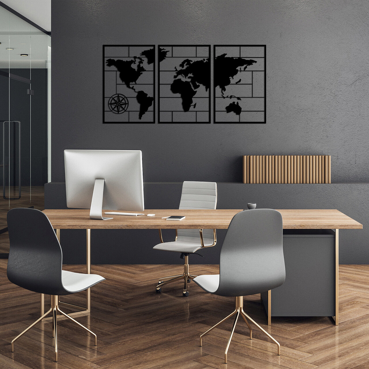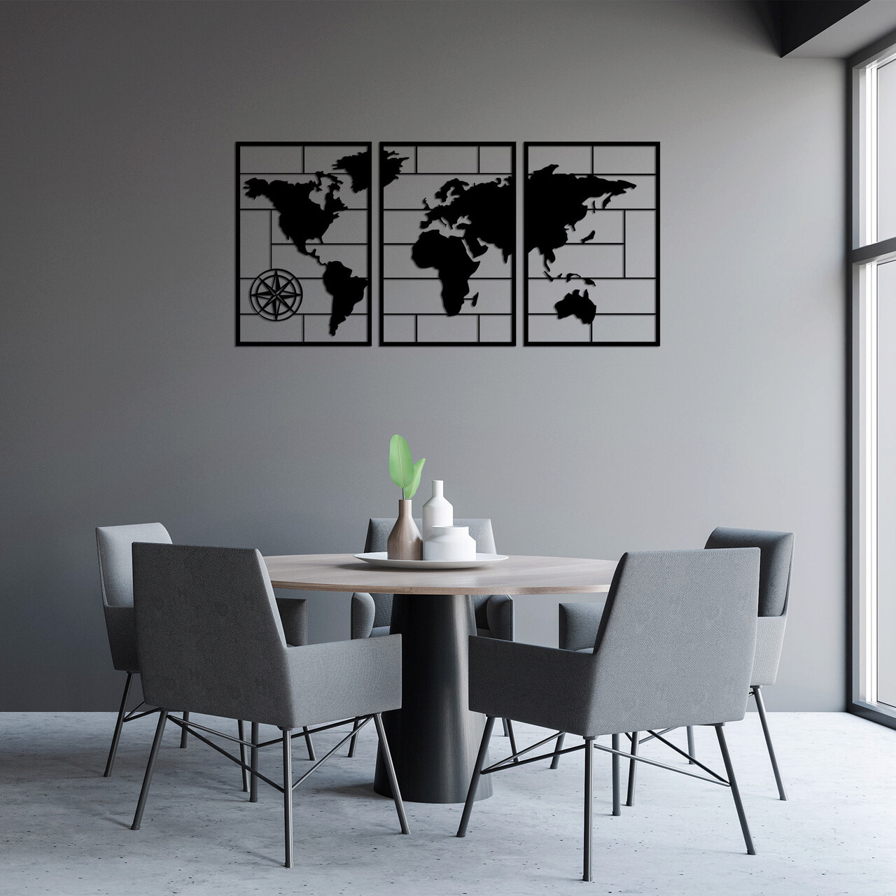 Decoratiune de perete, World Map, Metal, 50 x 75 cm, 3 piese, Negru