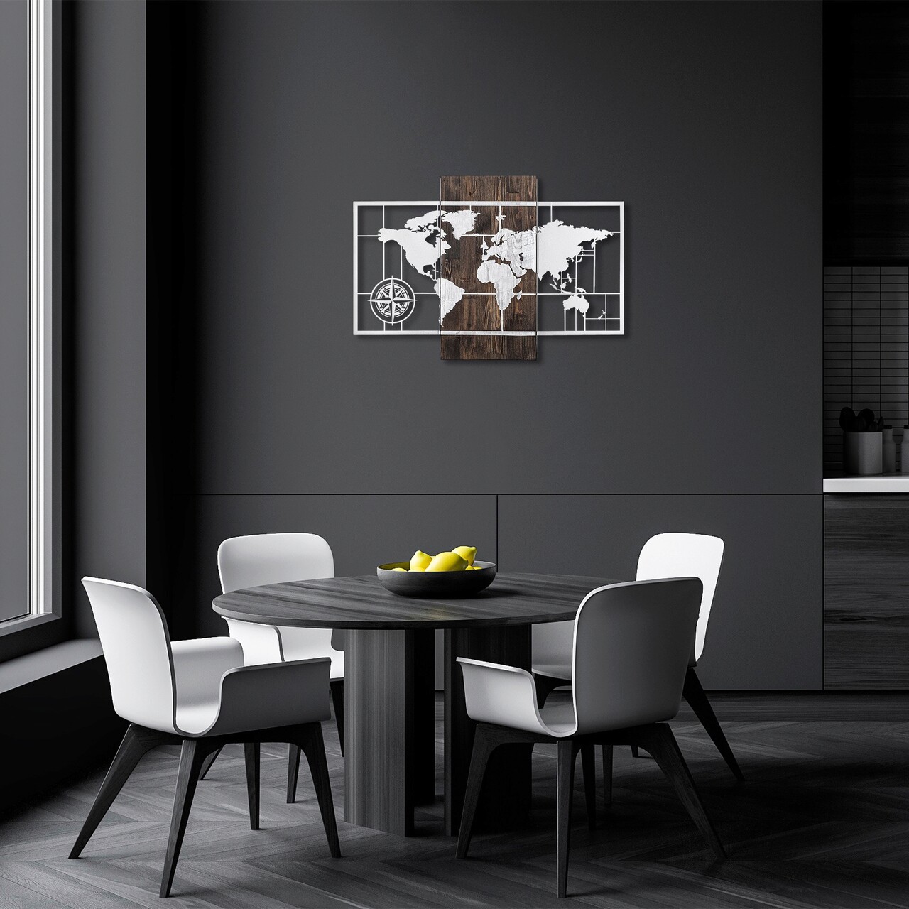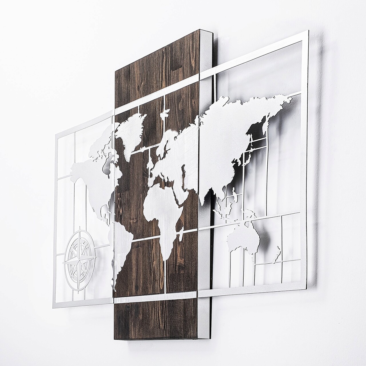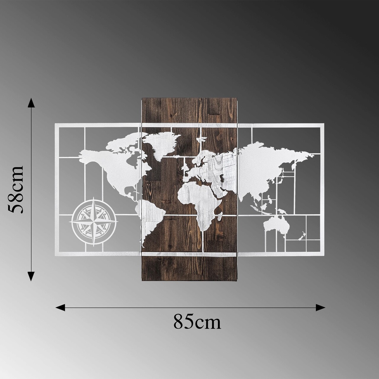 Decoratiune de perete, World Map Wıth Compass, 50% lemn/50% metal, Dimensiune: 85 x 58 cm, Nuc / Argint