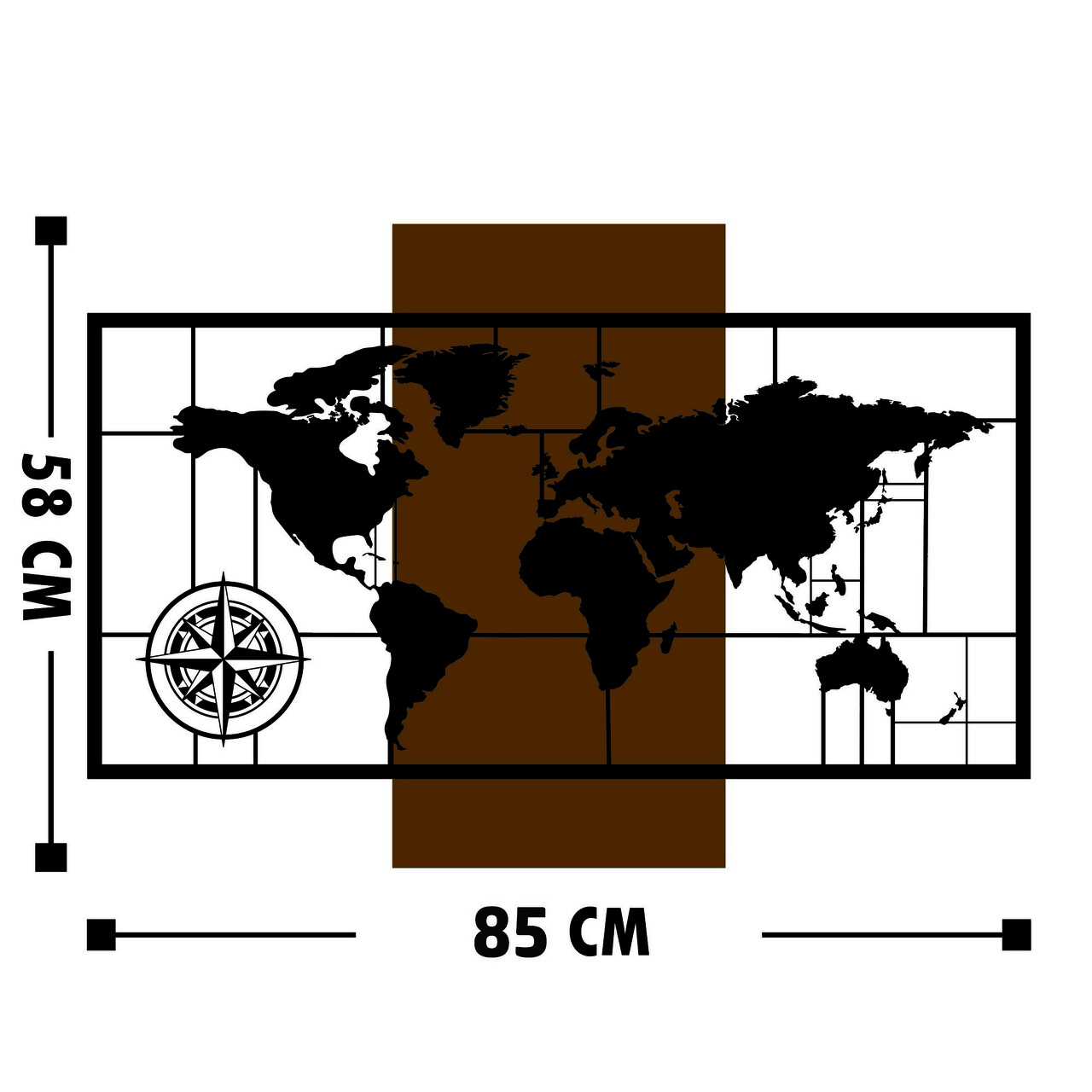 Decoratiune de perete, World Map With Compass, 50% lemn/50% metal, Dimensiune: 85 x 58 cm, Nuc / Negru