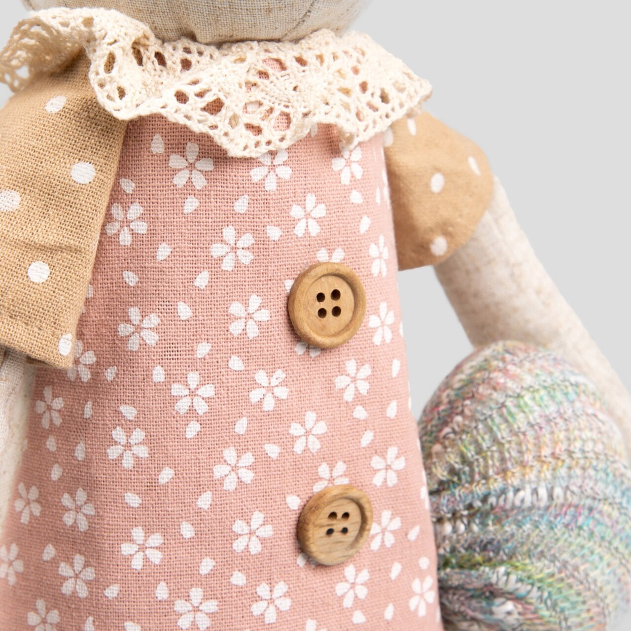 Figurina a fost confectionata din mai multe tipuri de tesaturi din poliester, a caror tesatura aminteste de tesaturile naturale. Hainele arata ca cele adevarate, iar baza si labutele iepurasului sunt realizate dintr-un material care aminteste de pasla moale.