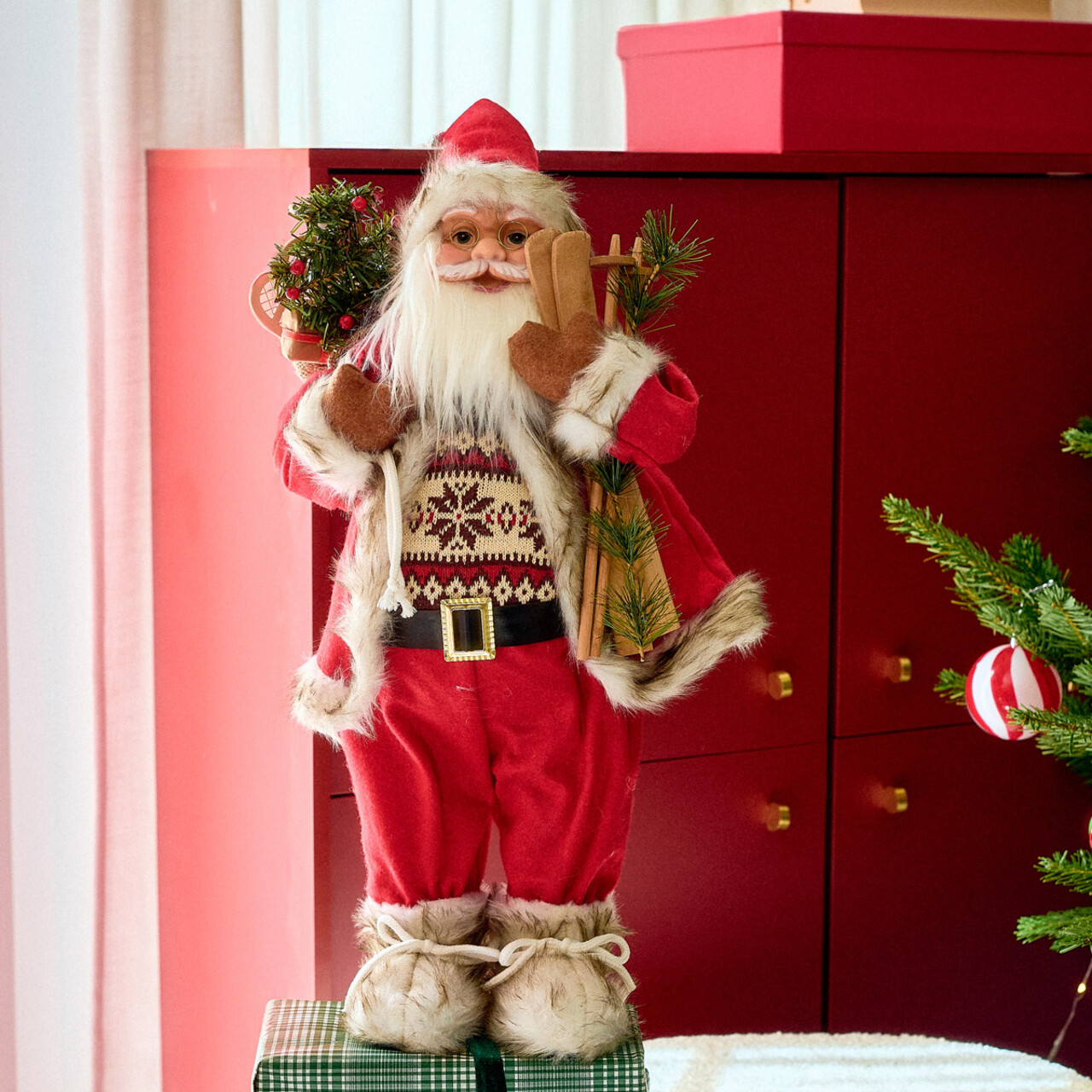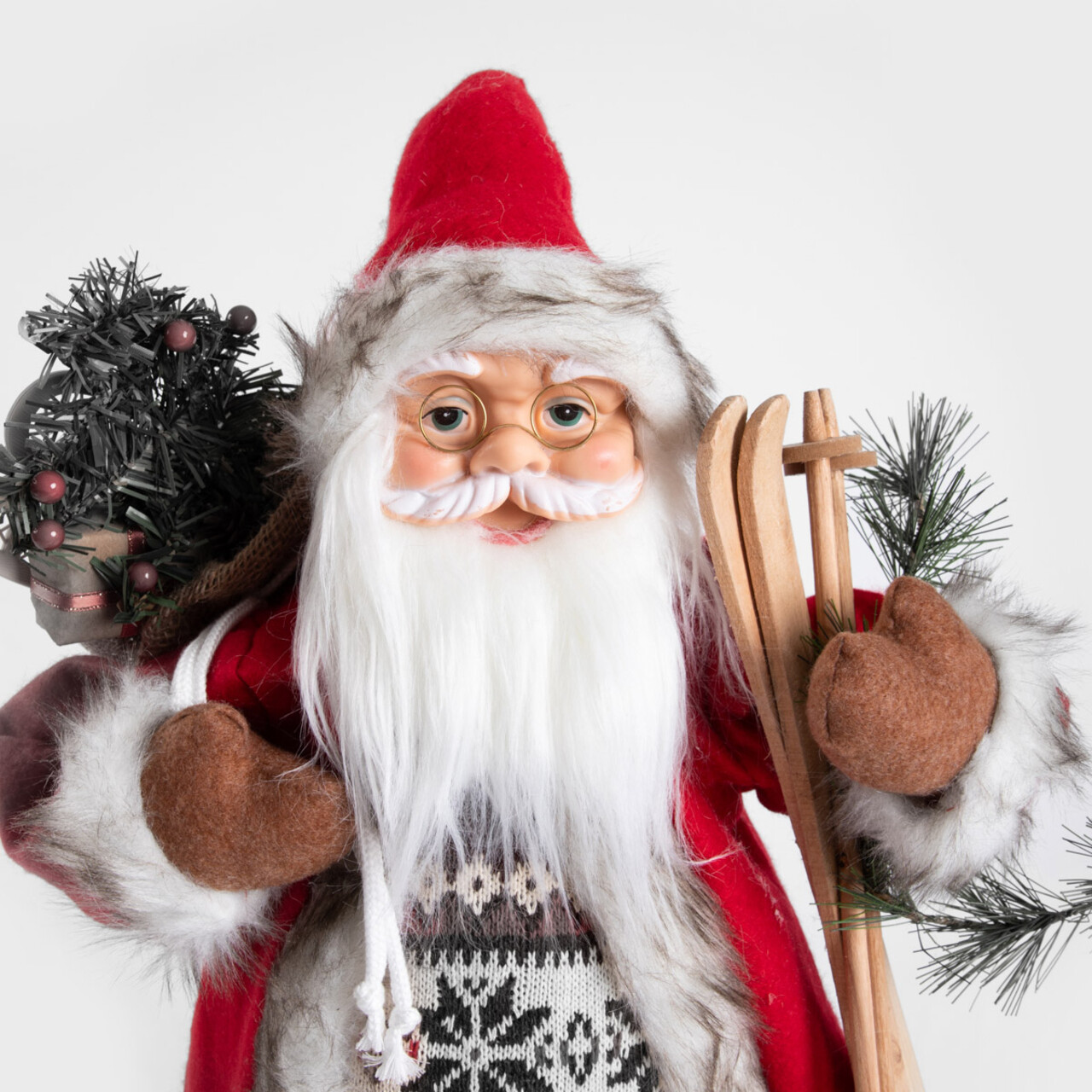 Decoratiunea Mos Craciun cu schiuri si pulover va crea o atmosfera unica in locuinta dumneavoastra. Decoratiunea CLAUSE prevazuta cu pulover, sac cu cadouri si schiuri reprezinta confortul si traditia de Craciun. Se va potrivi perfect in amenajarile clasice sau moderne, completandu-le frumos. Este, de asemenea, ideala pentru a fi oferita cadou.