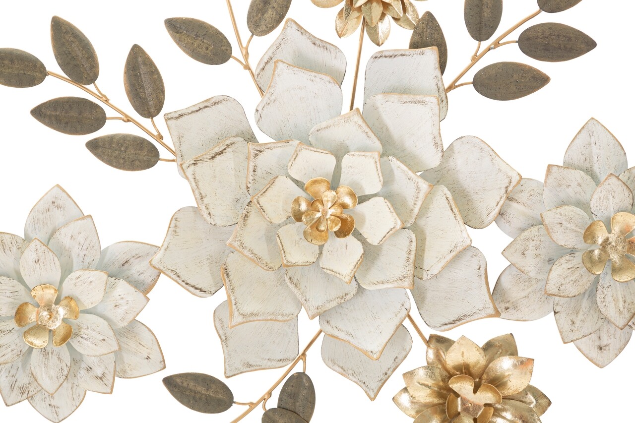 Panou decorativ de perete 3D format din flori si frunze in culori moi si patrunzatoare, infrumusetat cu finisaje aurii.
