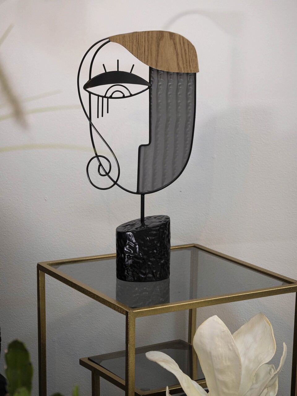 Sculptura eleganta din metal si MDF reprezentand un chip cu trasaturi cubiste, prevazuta cu o baza rotunda.